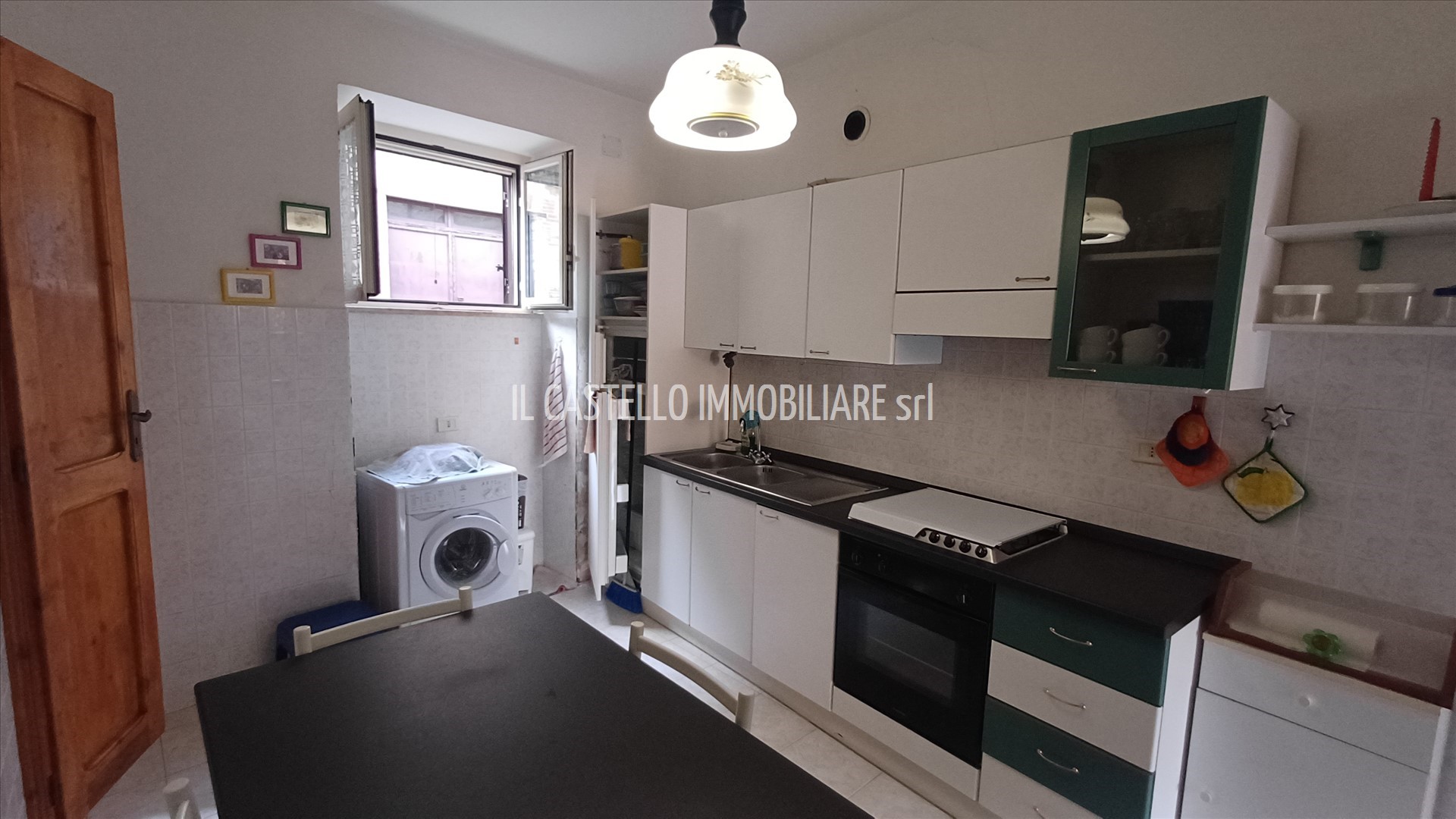 Al piano terra, ingresso (con scala all'ingresso per salire al piano soprastante) cucina-pranzo, ripostiglio, soggiorno con balcone.