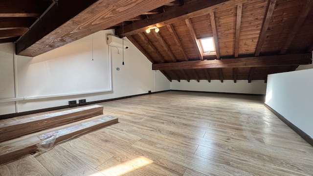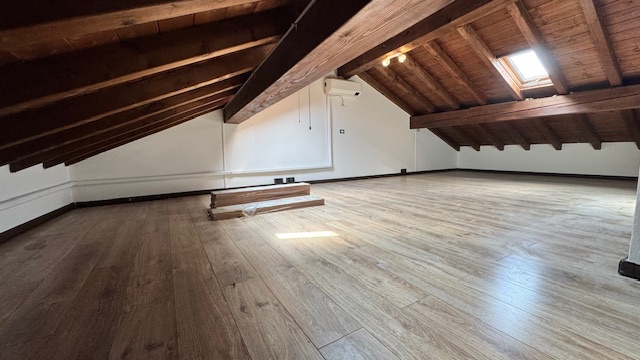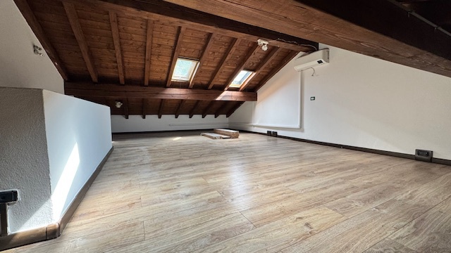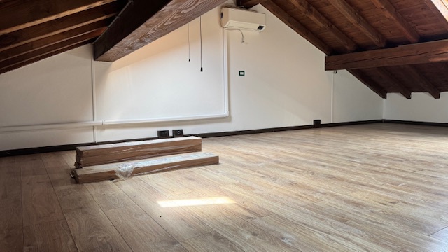 PARTICOLARE APPARTAMENTO POSTO SU DUE LIVELLI CON SOFFITTO CON TRAVI A VISTA.. Posto in circa 100 mq commerciali circa al primo piano ingresso, ampio soggiorno con adiacente ballatoio d' ingresso, cucina a vista, camera matrimoniale, cameretta, ripostiglio, bagno suddiviso in tre zone: reparto lavabo, reparto sanitari e reparto doccia, secondo ripostiglio per lavatrice e asciugatrice, al piano secondo, accessibile da scala a vista, si sviluppa spettacolare mansarda, più precisamente locale open space il quale potrebbe essere adibito a camere da letto o a zona hobby, studio ecc ecc. La soluzione immobiliare si perfeziona con un posto auto scoperto di proprietà all'interno del condominio.