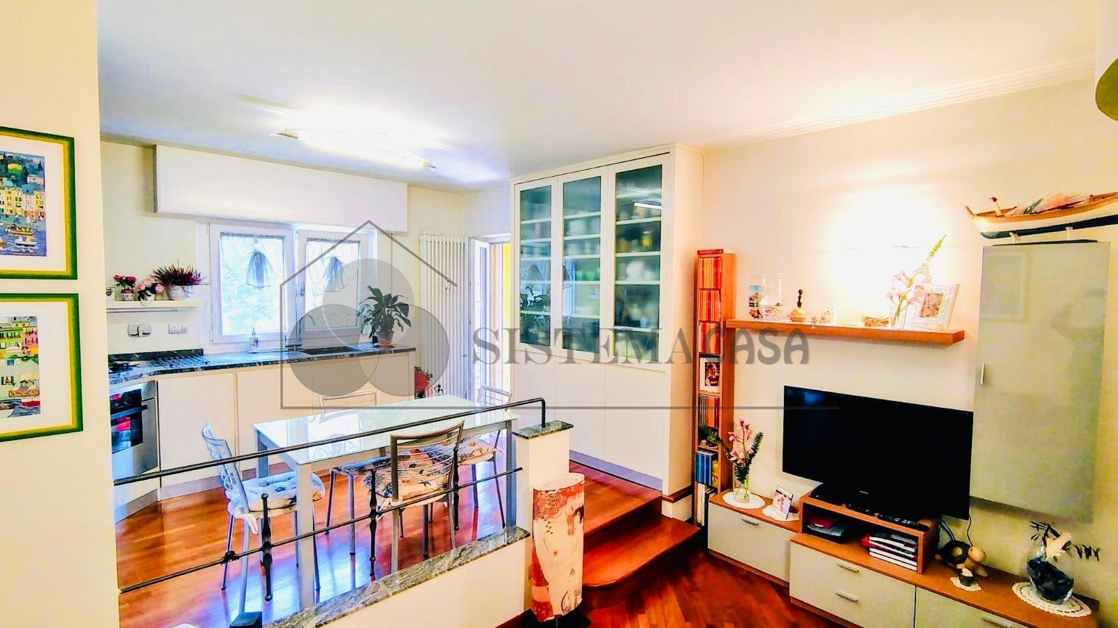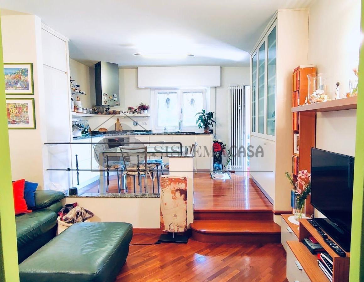 Gli ambienti sono valorizzati dalla presenza del parquet e da finiture contemporanee, che donano calore ed eleganza allabitazione.