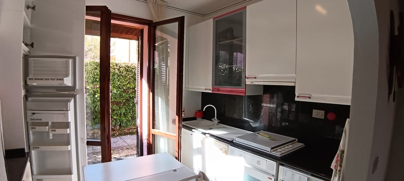 L'ingresso indipendente si apre sul luminoso soggiorno doppio con accesso al primo giardino, la cucina separata ha unampia porta finestra per accomodarsi nel secondo giardino, il ripostiglio ed il bagno finestrato con doccia completano questo piano.