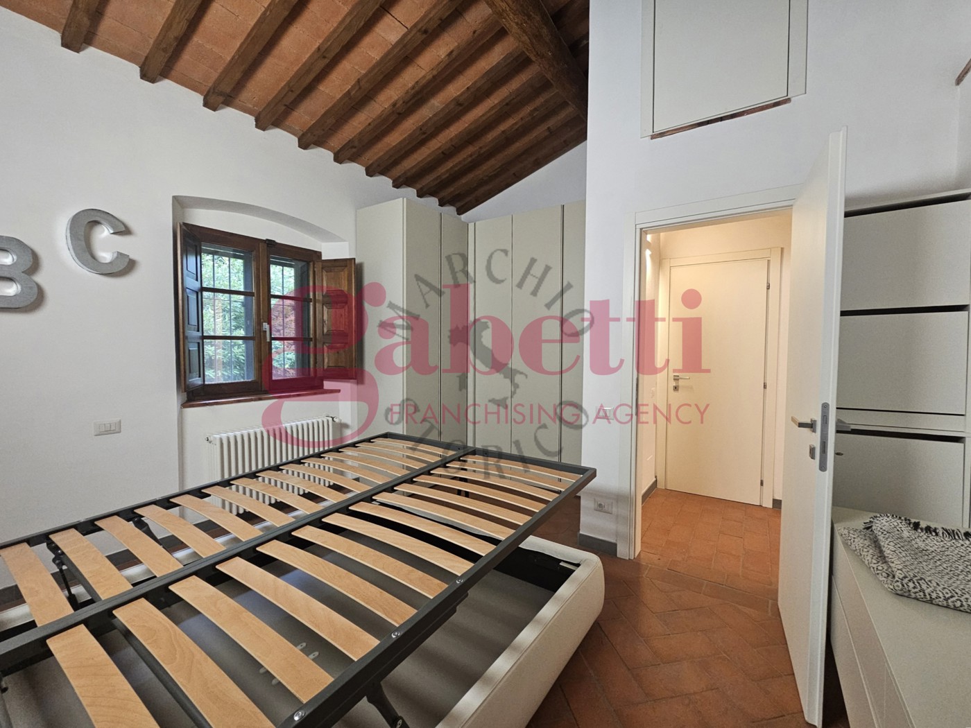 Da qui si accede al piano superiore tramite scala in pietra serena, che insieme ai pavimenti in cotto e alle travi a vista dona allimmobile uneleganza tipicamente toscana.