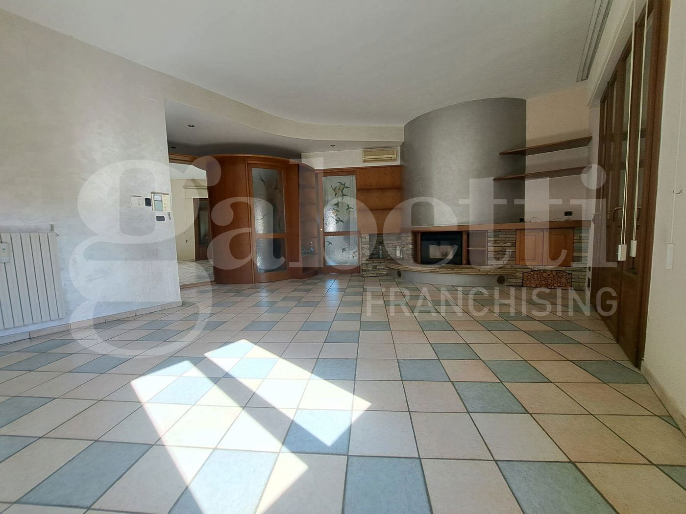 L'ingresso si apre direttamente sulla zona giorno tramite un portoncino blindato dove troviamo la sala con caminetto con terrazzo, la cucina abitabile, una zona lavanderia e un terrazzo, un disimpegno conduce alle due camere matrimoniali e al bagno con doccia.