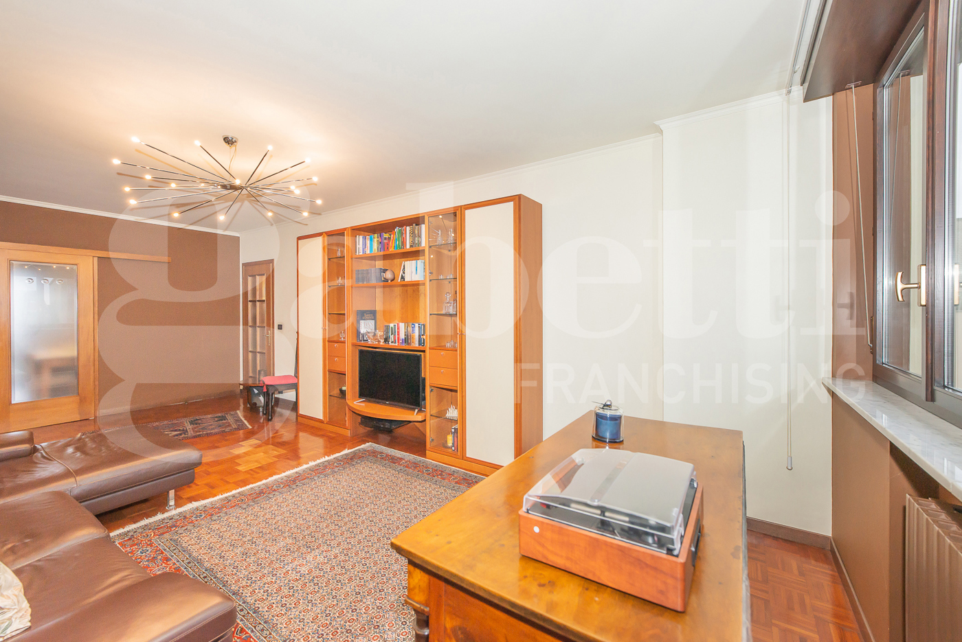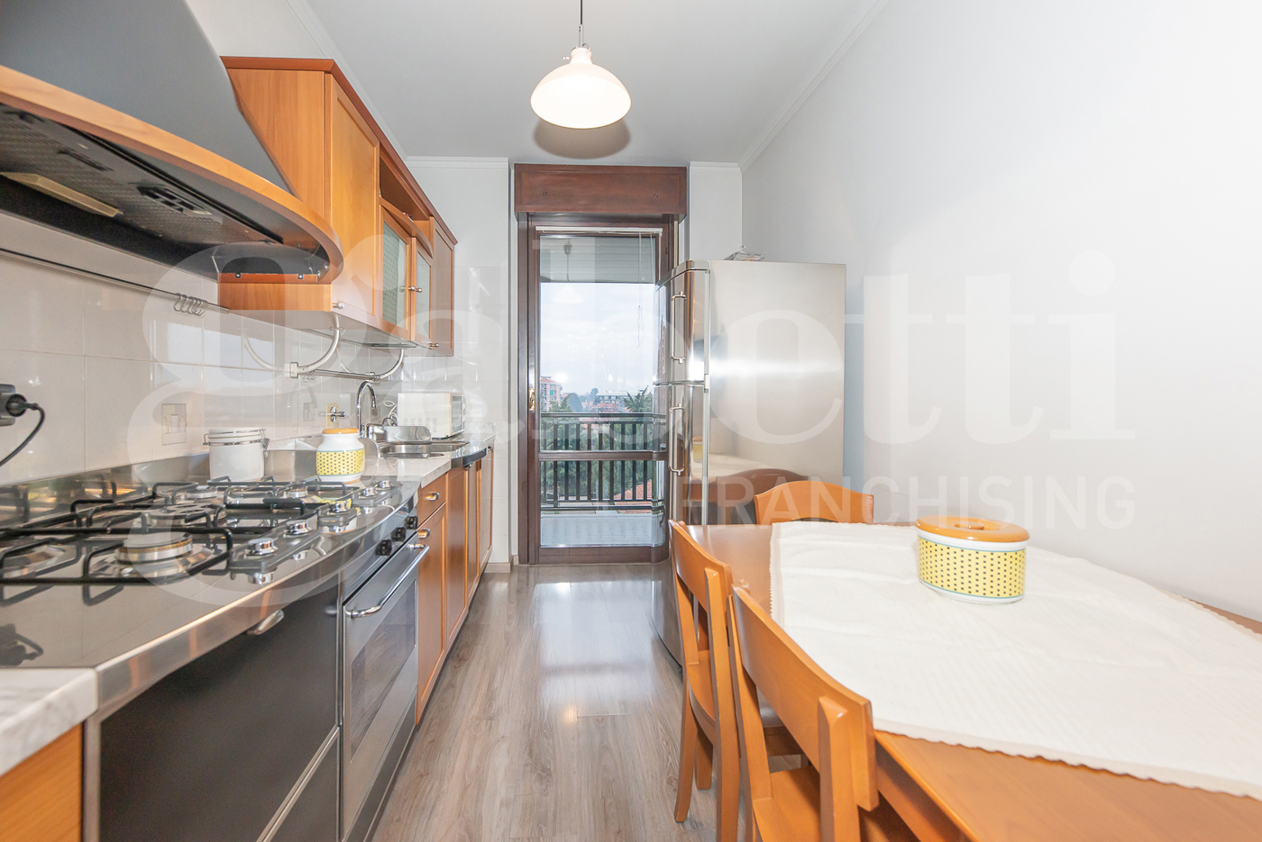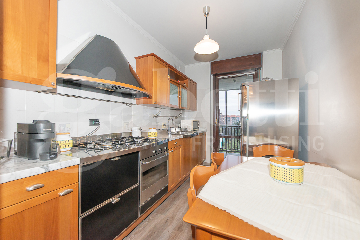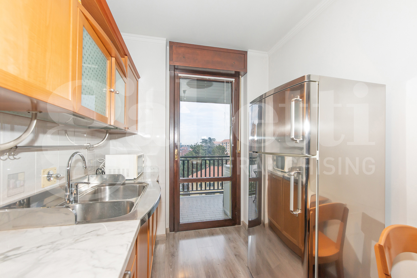 La Gabetti di Rivoli propone in vendita in zona comoda ai servizi e con molti spazi verdi, quadrilocale al quinto piano di uno stabile costruito negli anni 90. Limmobile cos composto : Attraverso la porta blindata si accede allampio salone, dove presente un bellissimo parquet e grandi finestre che permettono di avere luce naturale durante tutta la giornata, cucina abitabile con terrazzino, disimpegno, due ampie camere da letto doppi servizi il primo con vasca e finestra, laltro con doccia e ventilazione forzata.