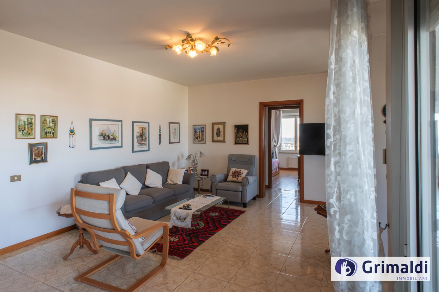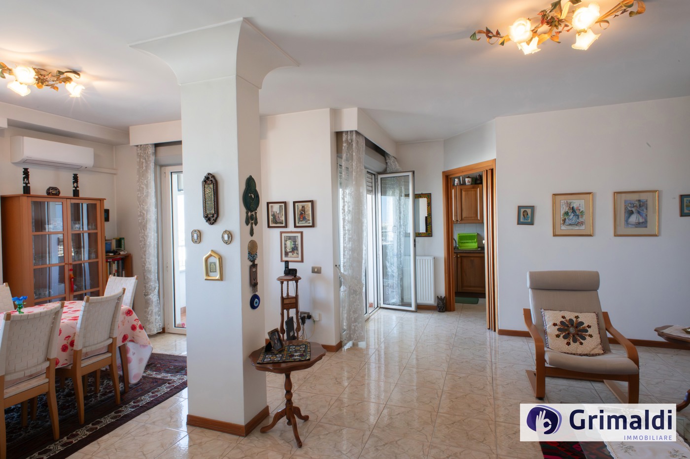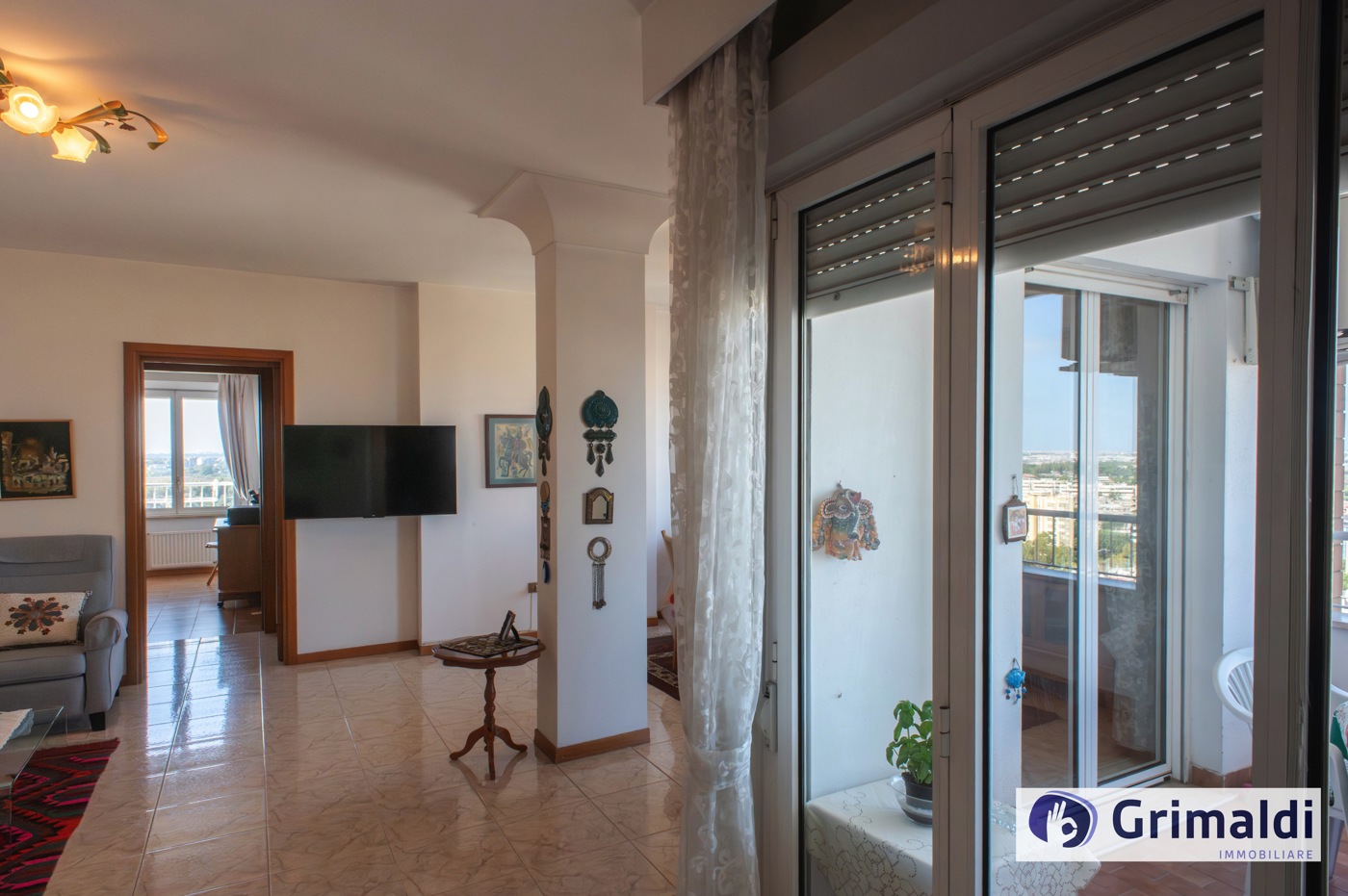 La composizione interna, ottimamente suddivisa in ampia zona giorno e riservata zona notte, prevede un ingresso con funzionale armadio a muro, salone doppio con affaccio sul terrazzo loggiato, cucina abitabile con uscita sul medesimo terrazzo, disimpegno, tre camere da letto, di cui una con bagno en suite, altro servizio finestrato con vasca.