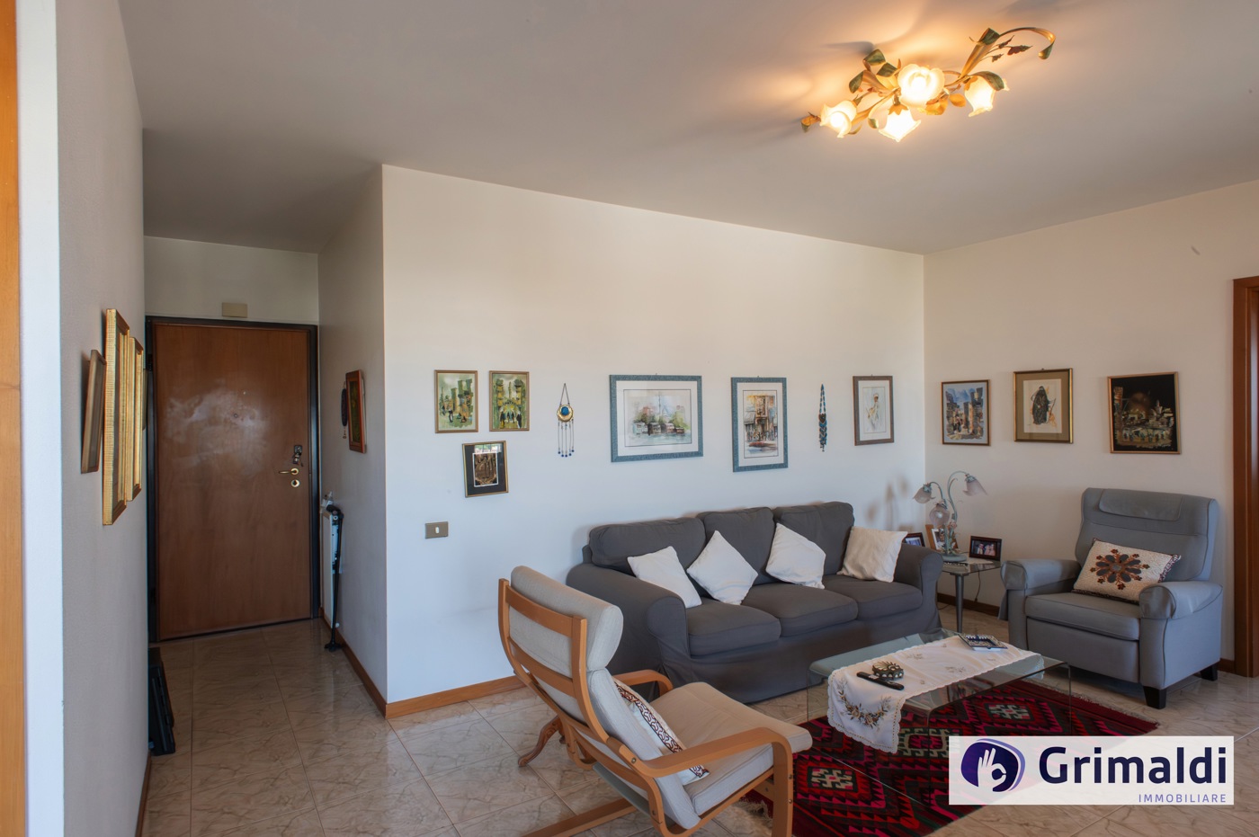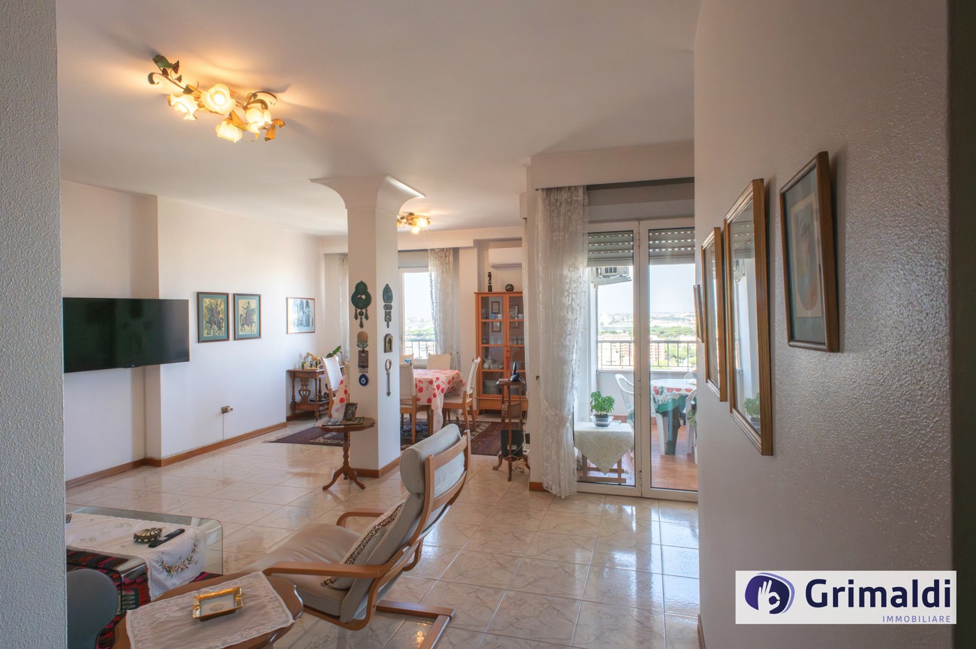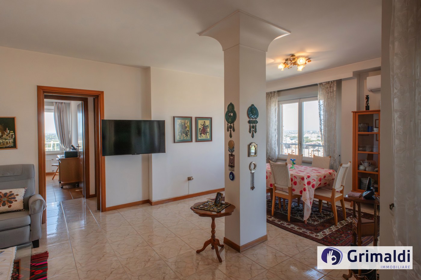 La composizione interna, ottimamente suddivisa in ampia zona giorno e riservata zona notte, prevede un ingresso con funzionale armadio a muro, salone doppio con affaccio sul terrazzo loggiato, cucina abitabile con uscita sul medesimo terrazzo, disimpegno, tre camere da letto, di cui una con bagno en suite, altro servizio finestrato con vasca.