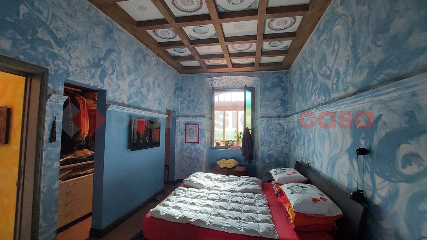 Il disimpegno conduce sia al bagno principale, rivestito in marmo con box doccia, che e alla zona notte, caratterizzata dal soffitto a cassettoni in legno e affreschi, suddivisa in una camera con cabina armadio e l'altra con soppalco, zona armadi e bagno privato.