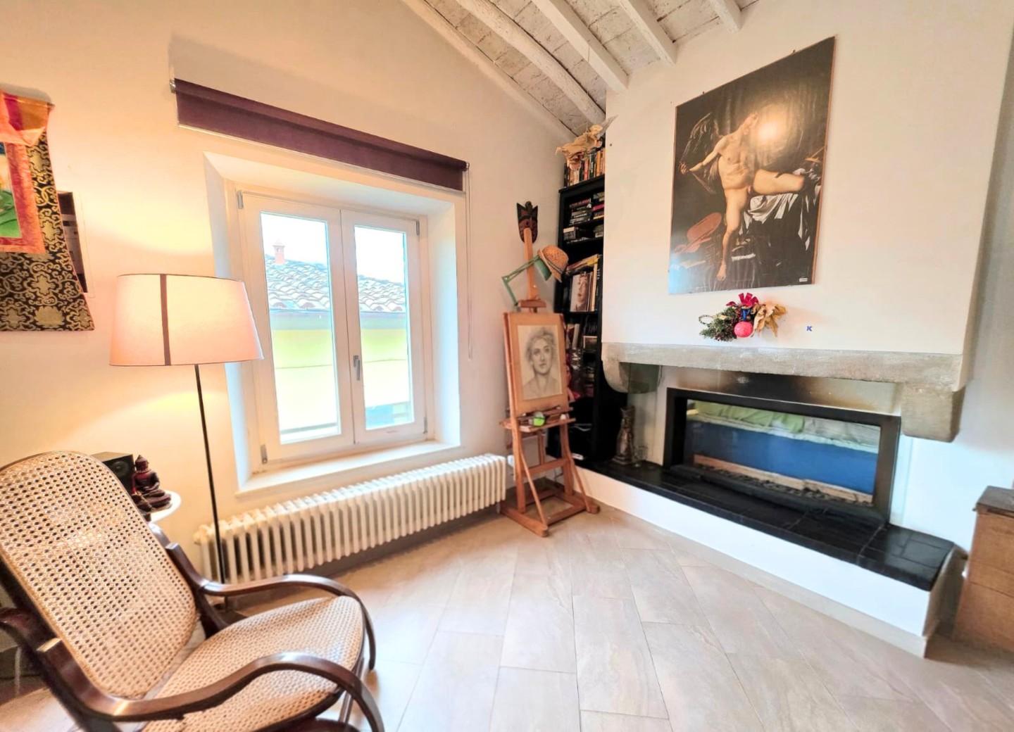 Limmobile si apre su un accogliente soggiorno impreziosito da camino, ideale per creare unatmosfera calda e conviviale.