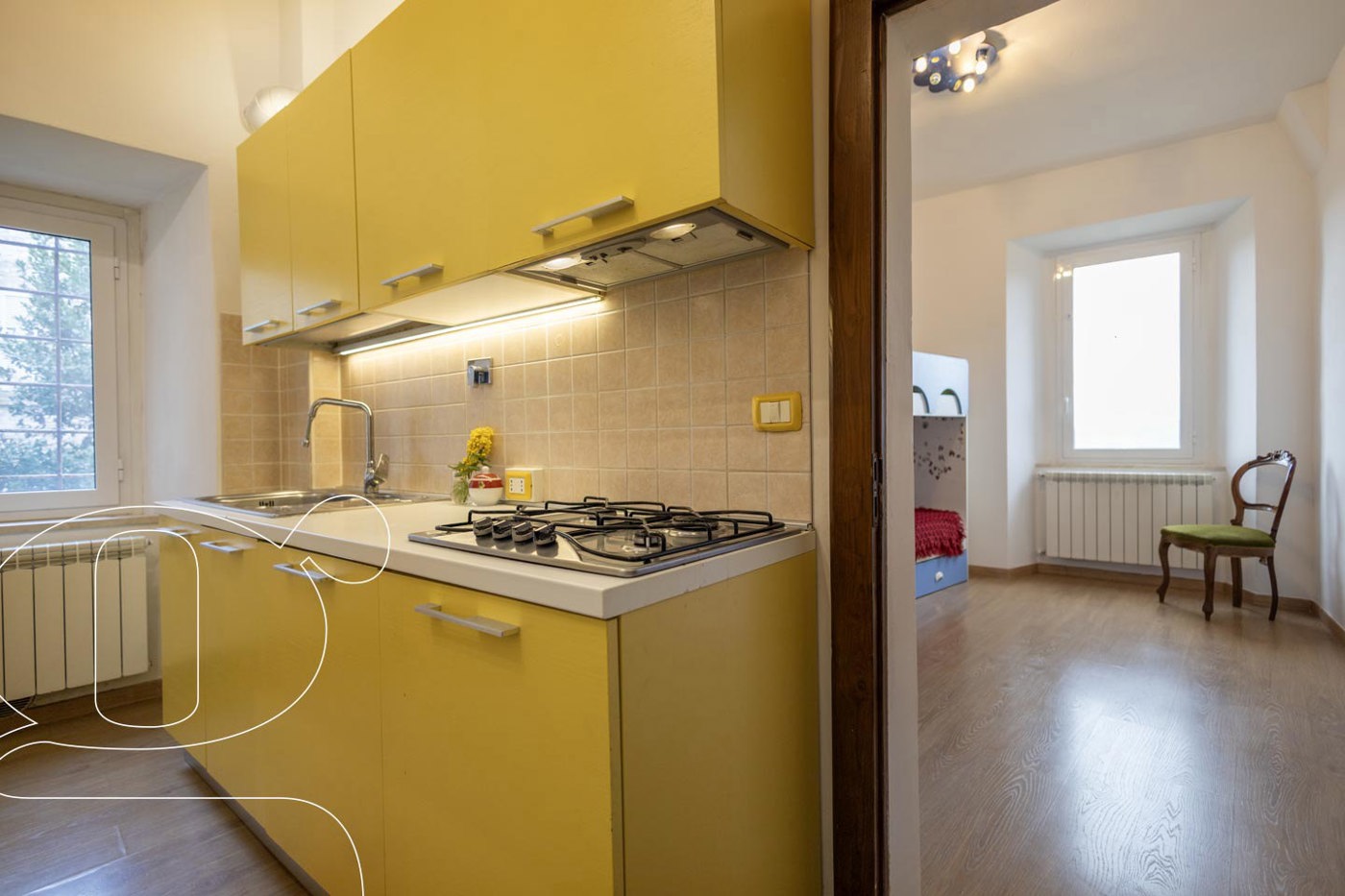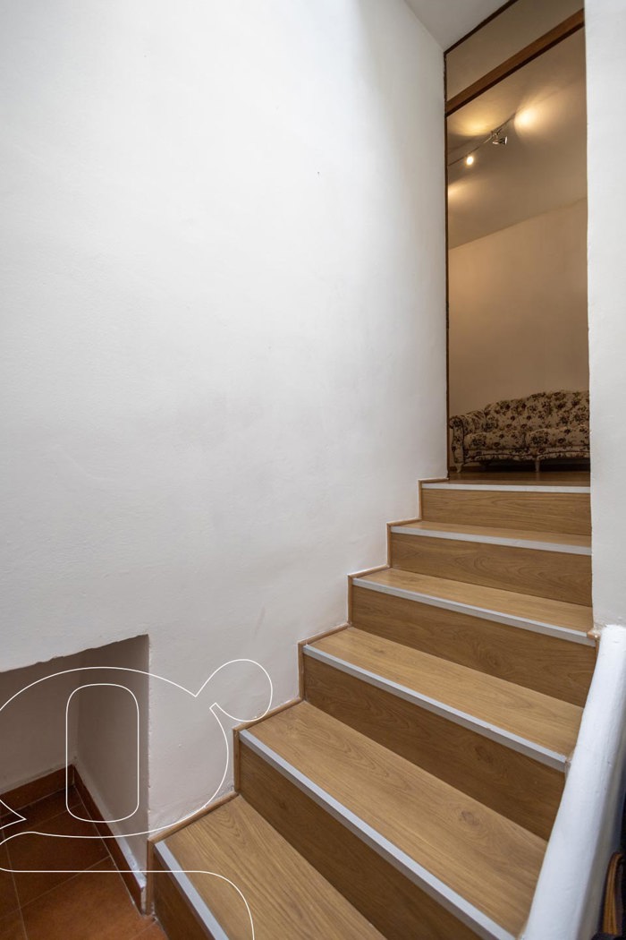 Salendo solo 6 gradini dall'androne privato si accede al piano principale: Un salotto centrale che disimpegna gli ambienti e un'ampia cucina abitabile.