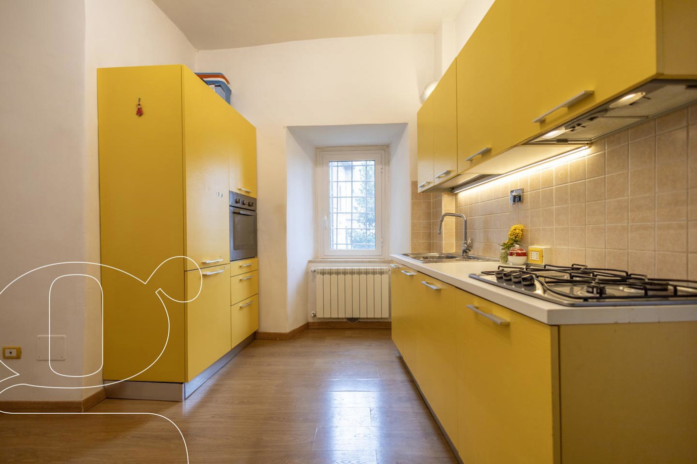 L'arredo allegro della cucina crea un elegante contrasto con le affascinanti porte antiche in legno e le maniglie in ottone originali.