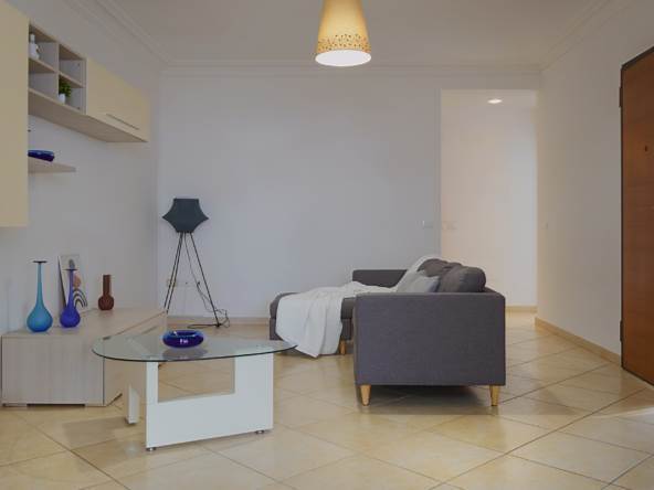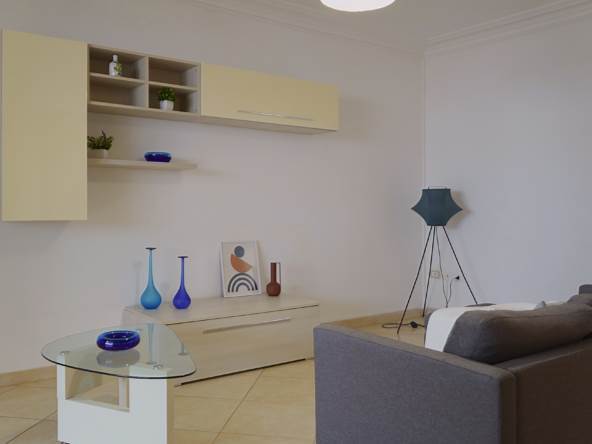 Lingresso si apre su un luminoso soggiorno, seguito da una cucina ampia e ben distribuita.