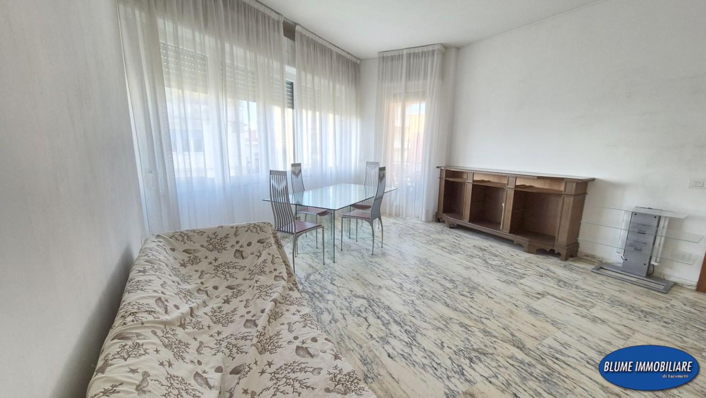 La superficie catastale è di mq. 103. Si compone: ingresso, ampia sala con terrazza comoda, vivibile, con vista mare, disimpegno con armadi, cucina semi abitabile con balcone di servizio con ripostiglio, due camere matrimoniali, ciascuna con accesso a balcone e due bagni finestrati, uno con doccia a l'altro con vasca.