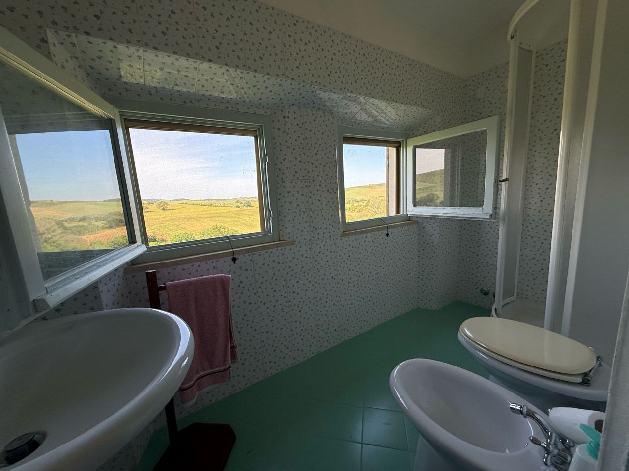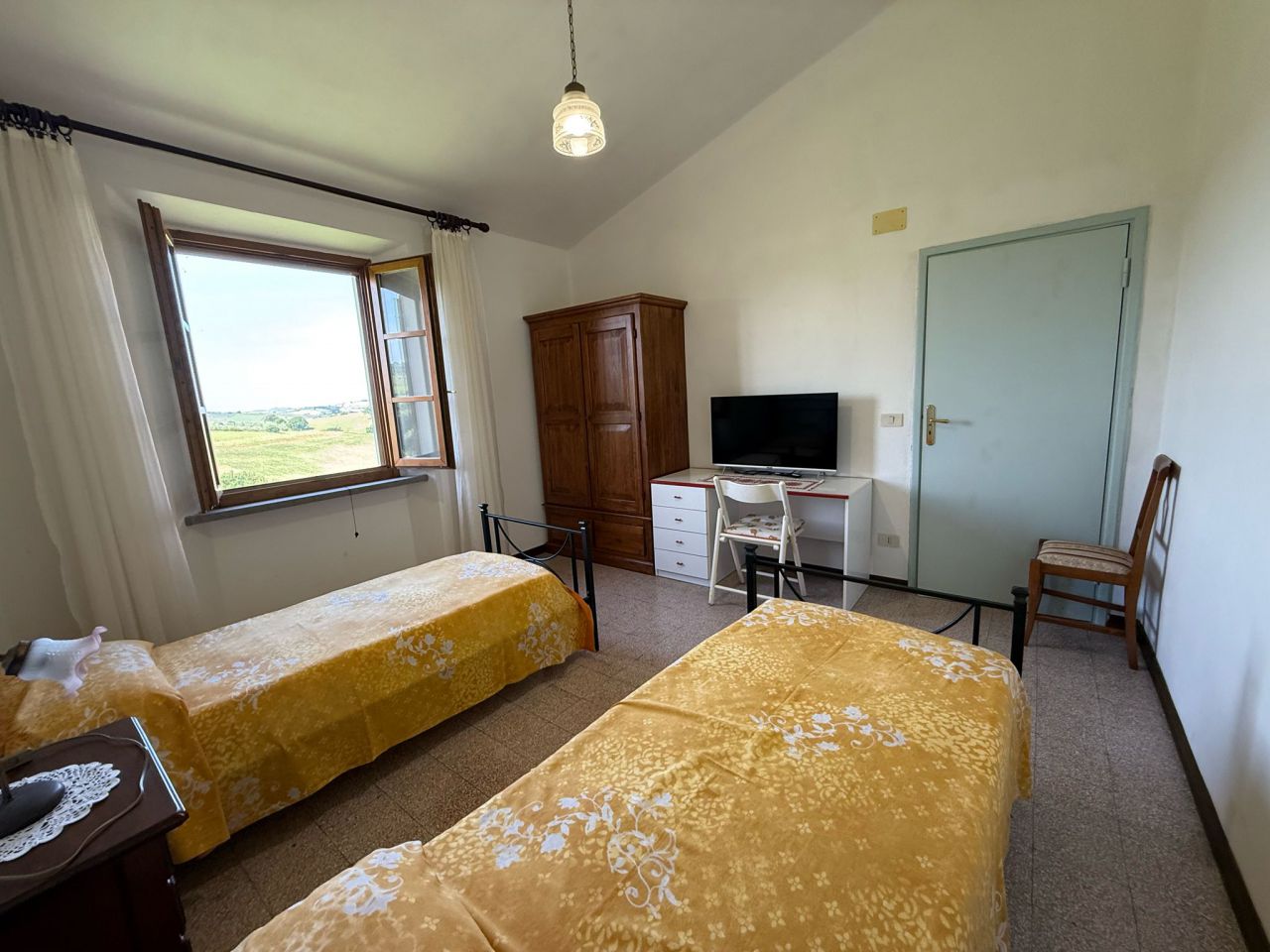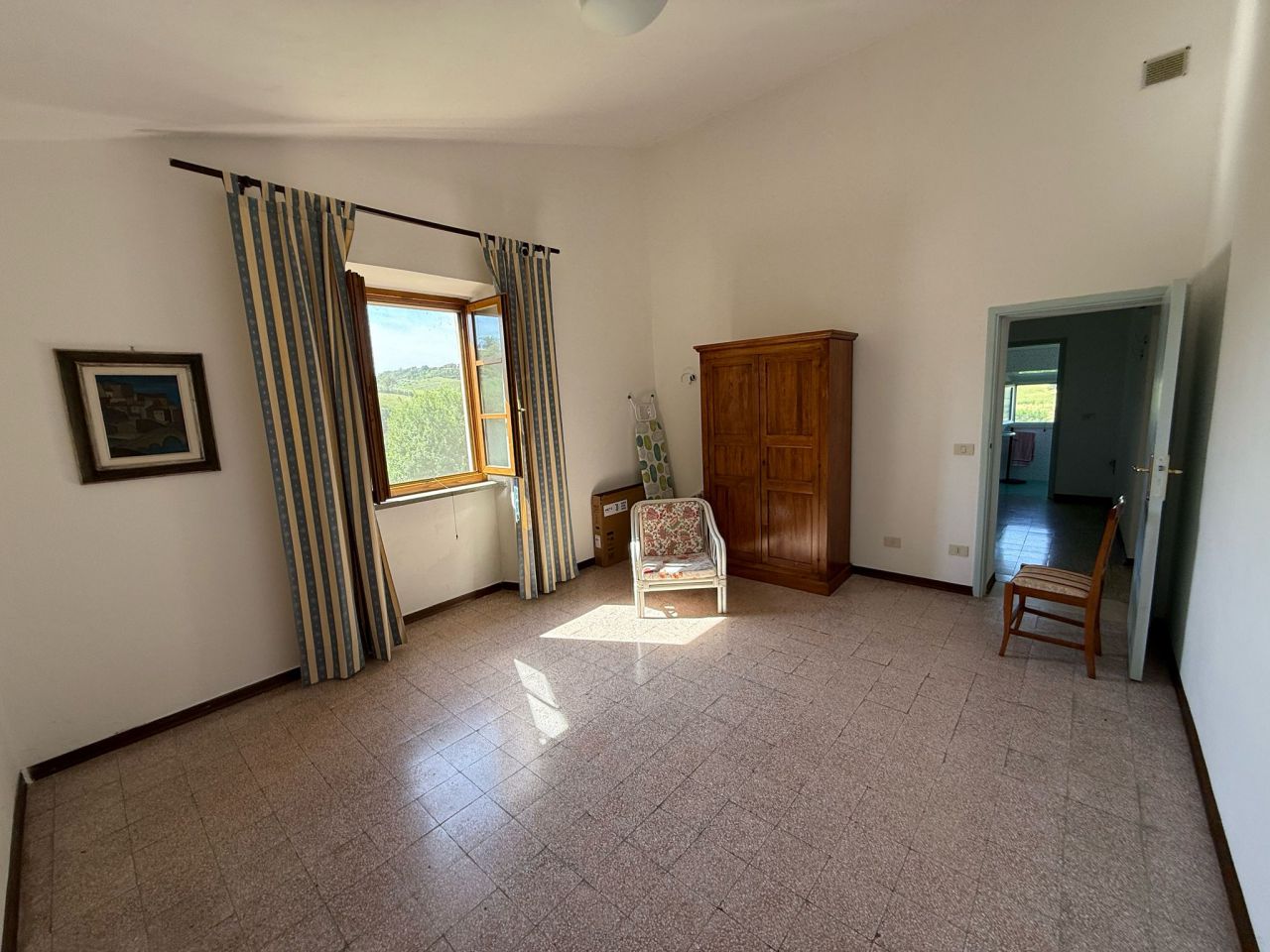 AGRO DI CAMPAGNATICO Zona Granaione in posizione incantevole proponiamo in vendita casale di campagna con 9 h circa di terreno parte seminativo e parte oliveto con circa 240 piante oltre ad una corte attorno alla casa di circa 3.000 mq, curata a giardino/parco l'immobile é sviluppato su 2 livelli ed è composto da 2 appartamenti indipendenti uno al piano terra ristrutturato completamente e composto da bellissimo soggiorno con zona cottura e camino, 2 matrimoniali una con spogliatoio e bagno al piano primo, altro appartamento indipendente a cui si accede da scala esterna, troviamo un appartamento composto da ingresso su cucina, 3 camere e bagno completano la proprietà un garage di circa 35 mq, vari annessi come una ex porcilaia, il forno ed un gazebo, sotto al quale è presente una cisterna di raccolta delle acque piovane.