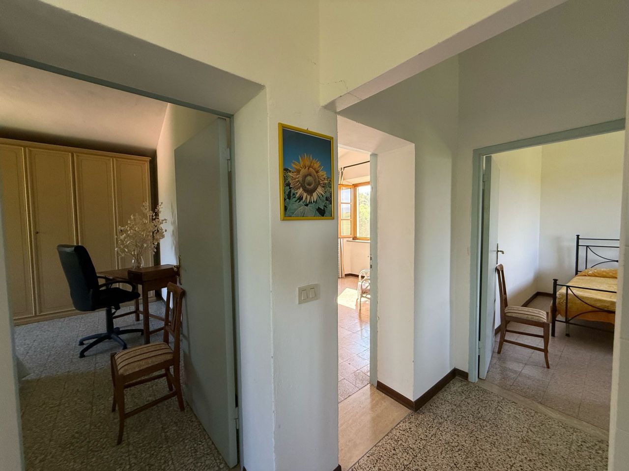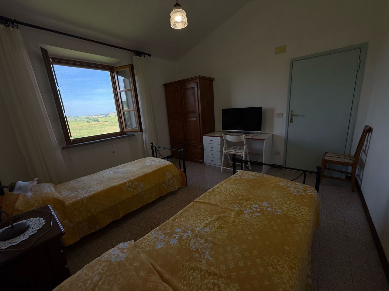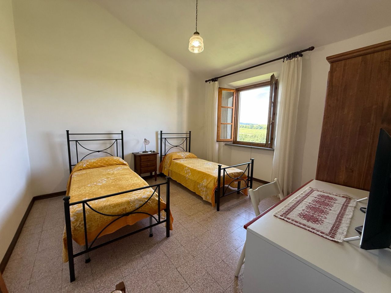 AGRO DI CAMPAGNATICO Zona Granaione in posizione incantevole proponiamo in vendita casale di campagna con 9 h circa di terreno parte seminativo e parte oliveto con circa 240 piante oltre ad una corte attorno alla casa di circa 3.000 mq, curata a giardino/parco l'immobile é sviluppato su 2 livelli ed è composto da 2 appartamenti indipendenti uno al piano terra ristrutturato completamente e composto da bellissimo soggiorno con zona cottura e camino, 2 matrimoniali una con spogliatoio e bagno al piano primo, altro appartamento indipendente a cui si accede da scala esterna, troviamo un appartamento composto da ingresso su cucina, 3 camere e bagno completano la proprietà un garage di circa 35 mq, vari annessi come una ex porcilaia, il forno ed un gazebo, sotto al quale è presente una cisterna di raccolta delle acque piovane.