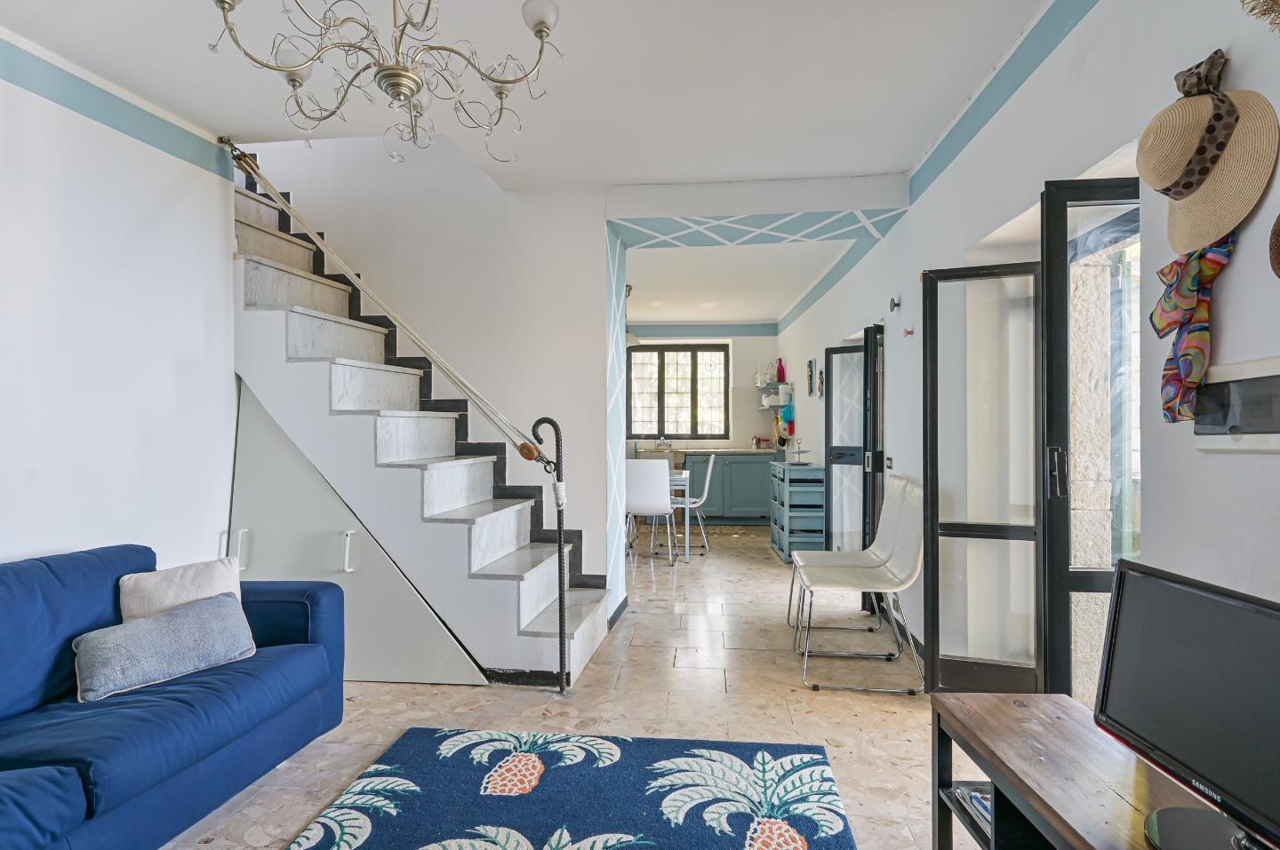 All'esterno dell'immobile troviamo un porticato per pranzi e cene all'aperto, una terrazza sospesa sul mare e un giardino pianeggiante con ulivi e alberi da frutta.
