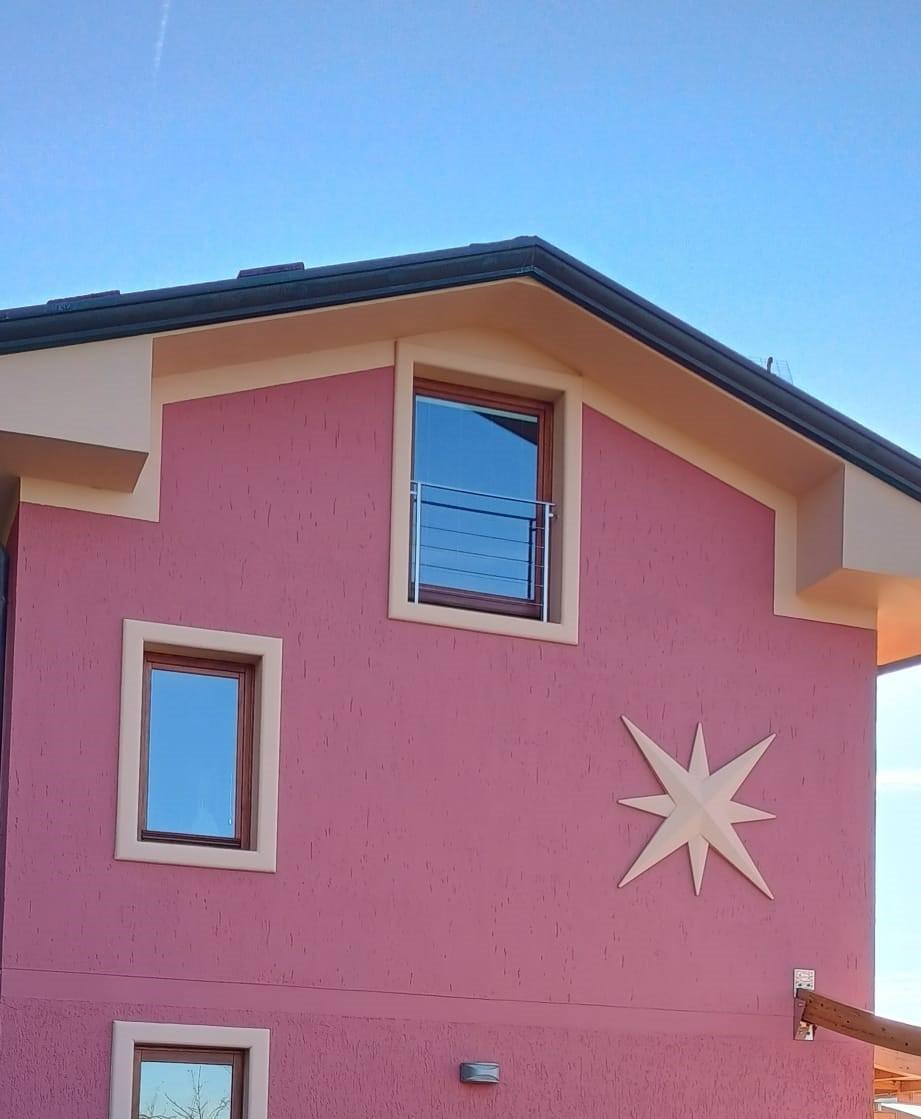 A dispetto dell'aspetto esteriore, se pur curato in ogni dettaglio e di un bel colore acceso, si entra direttamente in un ambiente continuo, moderno e di gusto di 100mq che comprende una ampia e bella sala con un caminetto di design , sala pranzo e cucina oltre alla scala che porta ai piani superiori, mista in pietra per le prime due rampe, in ferro e legno per le successive con passamano in acciaio, seminascosta da due quinte prodotte dal muro di sostegno.