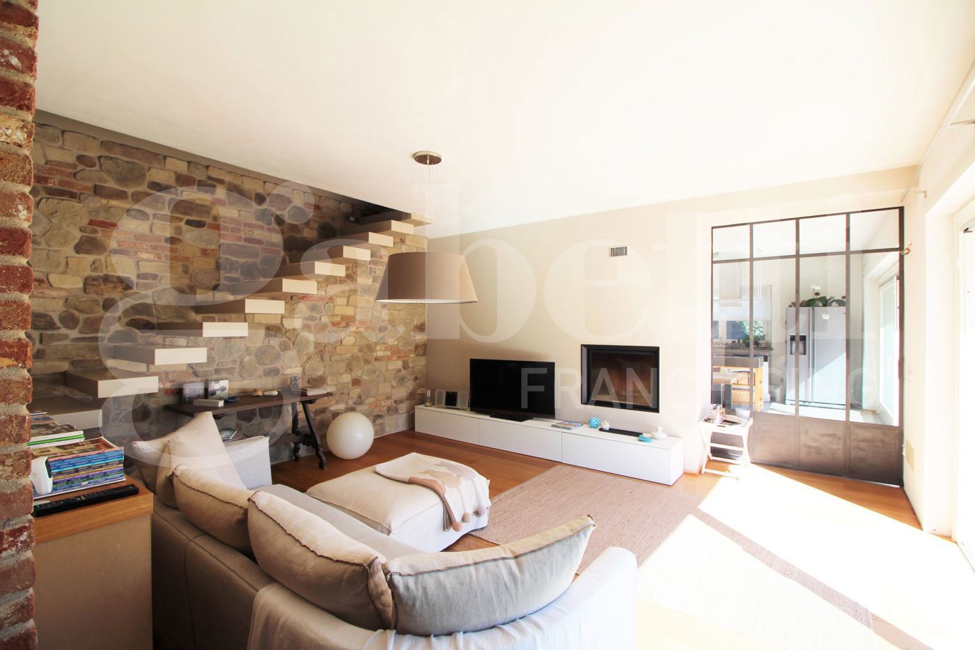 L'immobile si compone di ingresso al piano terra in ampio disimpegno con ripostiglio, zona giorno, con camino bi facciale, caratterizzata da elementi in sasso e pietra e un'ampia vetrata sul cortile ideale per pranzi e cene all'aperto, e ampia cucina abitabile e un bagno; Tramite delle scale di design si accede al primo piano dove si sviluppa la zona notte composta da una grande camera da letto con cabina armadio e bagno privato, seconda camera da letto dalla quale e possibile ricavare due camere e cabina armadio, e terzo bagno.