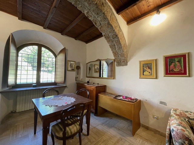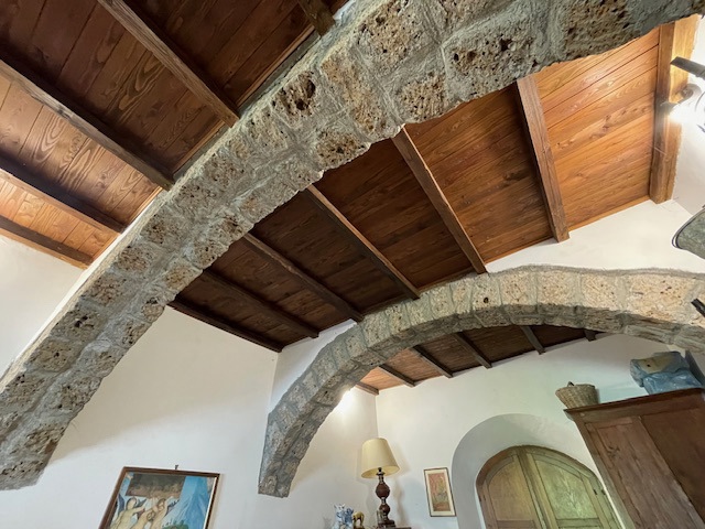 Recandoci poi nella zona taverna, troviamo una cucina abitabile, uno spazioso salone anch'esso con travi in legno e con soffitti a volta in pietra, un bagno con doccia, e grandi porte finestre con grate in ferro.