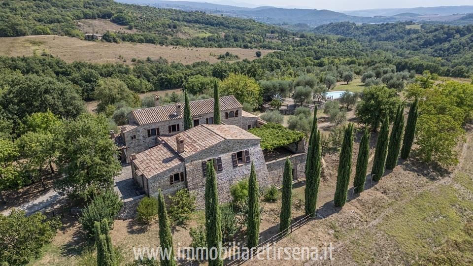 La proprietà è un'oasi di pace e bellezza, con una piscina rialzata a sfioro che sembra fondersi con l'orizzonte, offrendo una vista mozzafiato sulla campagna circostante.