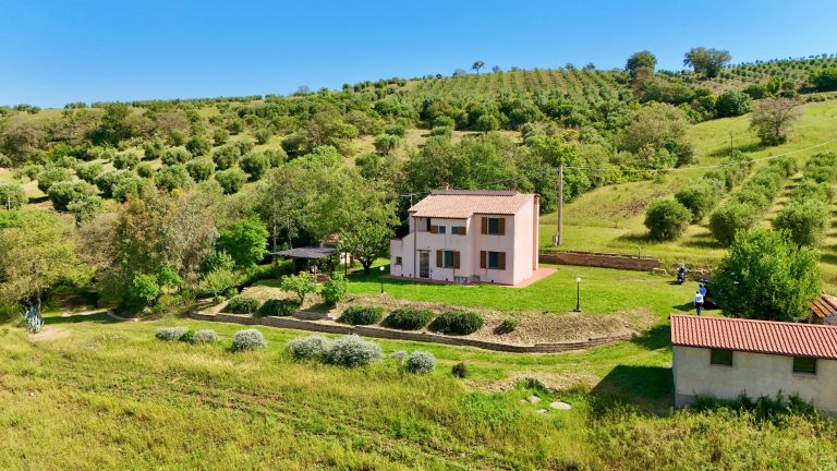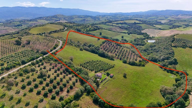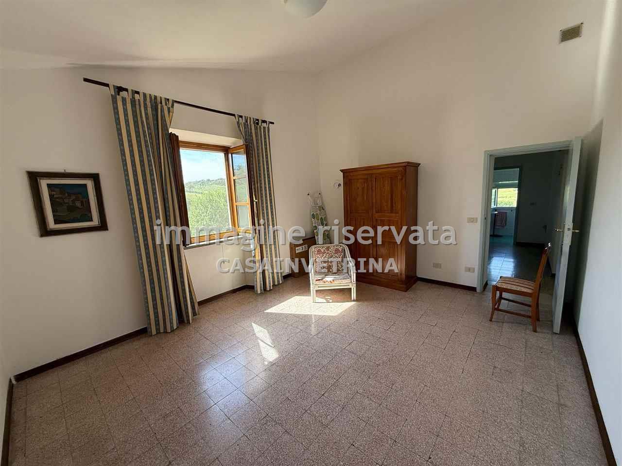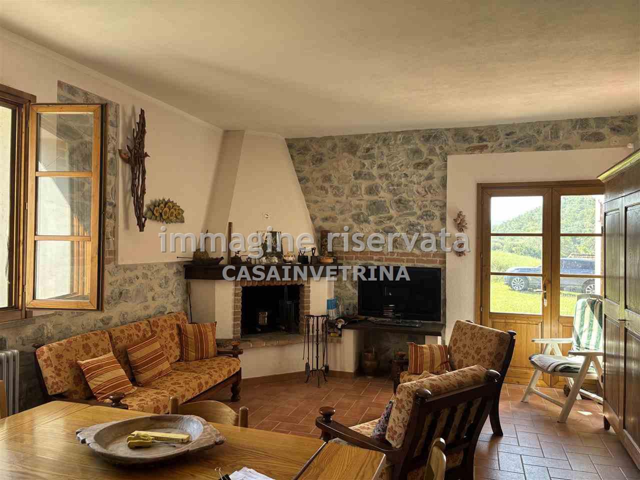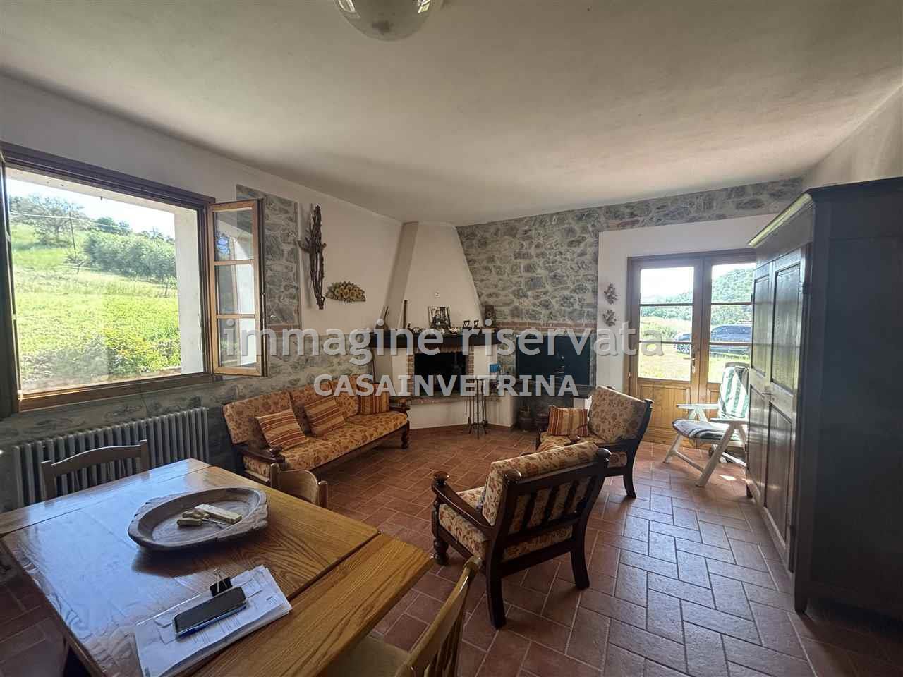 AGRO DI CAMPAGNATICO Zona Granaione in posizione incantevole proponiamo in vendita casale di campagna con 9 h circa di terreno parte seminativo e parte oliveto con circa 240 piante oltre ad una corte attorno alla casa di circa 3.000 mq, curata a giardino/parco l'immobile é sviluppato su 2 livelli ed è composto da 2 appartamenti indipendenti uno al piano terra ristrutturato completamente e composto da bellissimo soggiorno con zona cottura e camino, 2 matrimoniali una con spogliatoio e bagno al piano primo, altro appartamento indipendente a cui si accede da scala esterna, troviamo un appartamento composto da ingresso su cucina, 3 camere e bagno completano la proprietà un garage di circa 35 mq, vari annessi come una ex porcilaia, il forno ed un gazebo, sotto al quale è presente una cisterna di raccolta delle acque piovane.