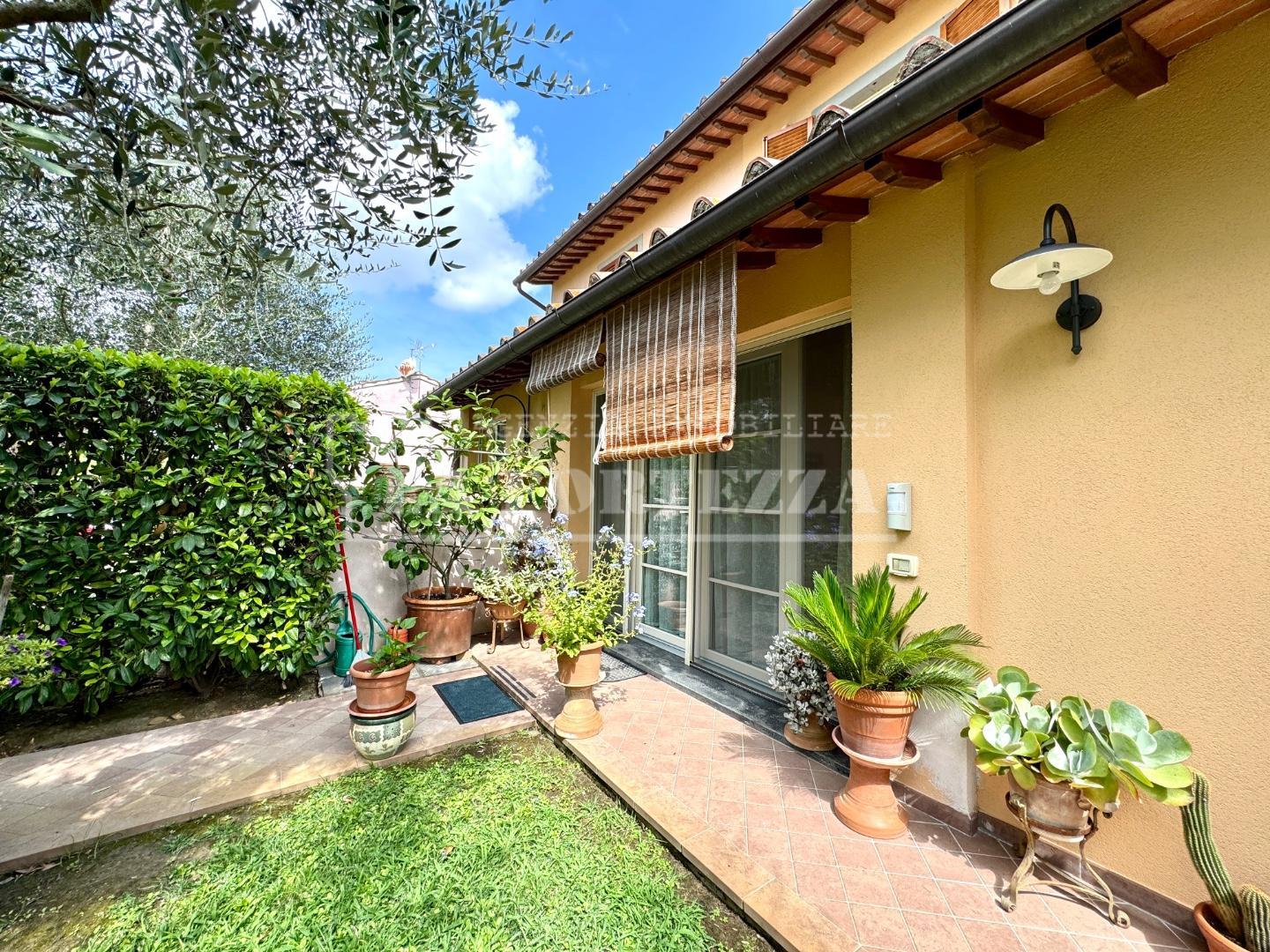La proprietà, libera su due lati, vanta un giardino ben curato fronte/retro di circa 80 mq. ed internamente è così composta: al piano terra l' ingresso principale avviene nell' ampio soggiorno molto luminoso grazie alle ampie vetrate, la cucina abitabile (ingresso secondario) permette l' accesso al giardino retrostante, il bagno di servizio è completo di tutti gli elementi ed il sottoscala è utilizzato come ripostiglio.