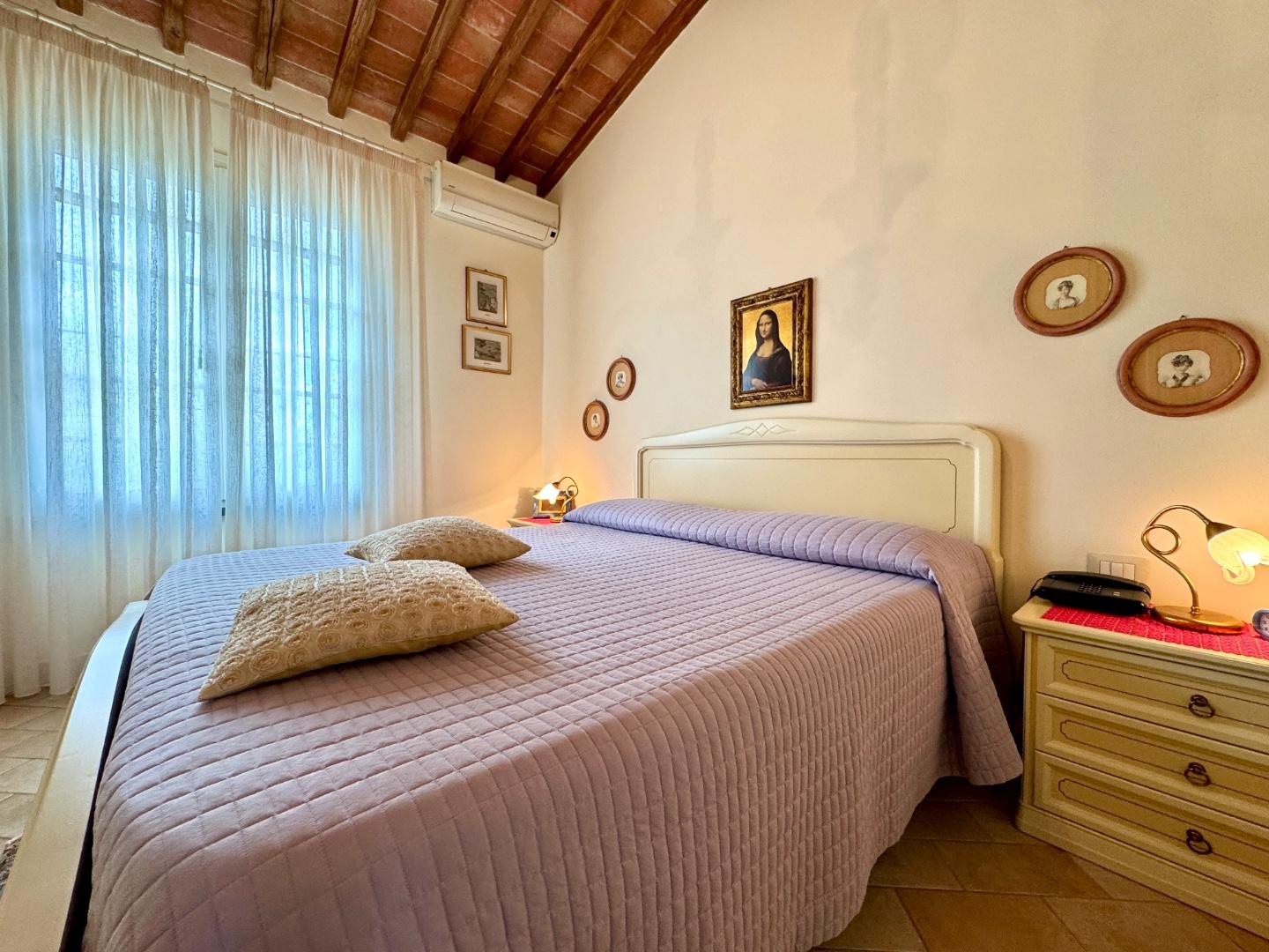 Una comoda scala interna conduce al piano primo, dove troviamo una spaziosa camera matrimoniale, una camera singola, un ripostiglio e un secondo bagno dotato di vasca.