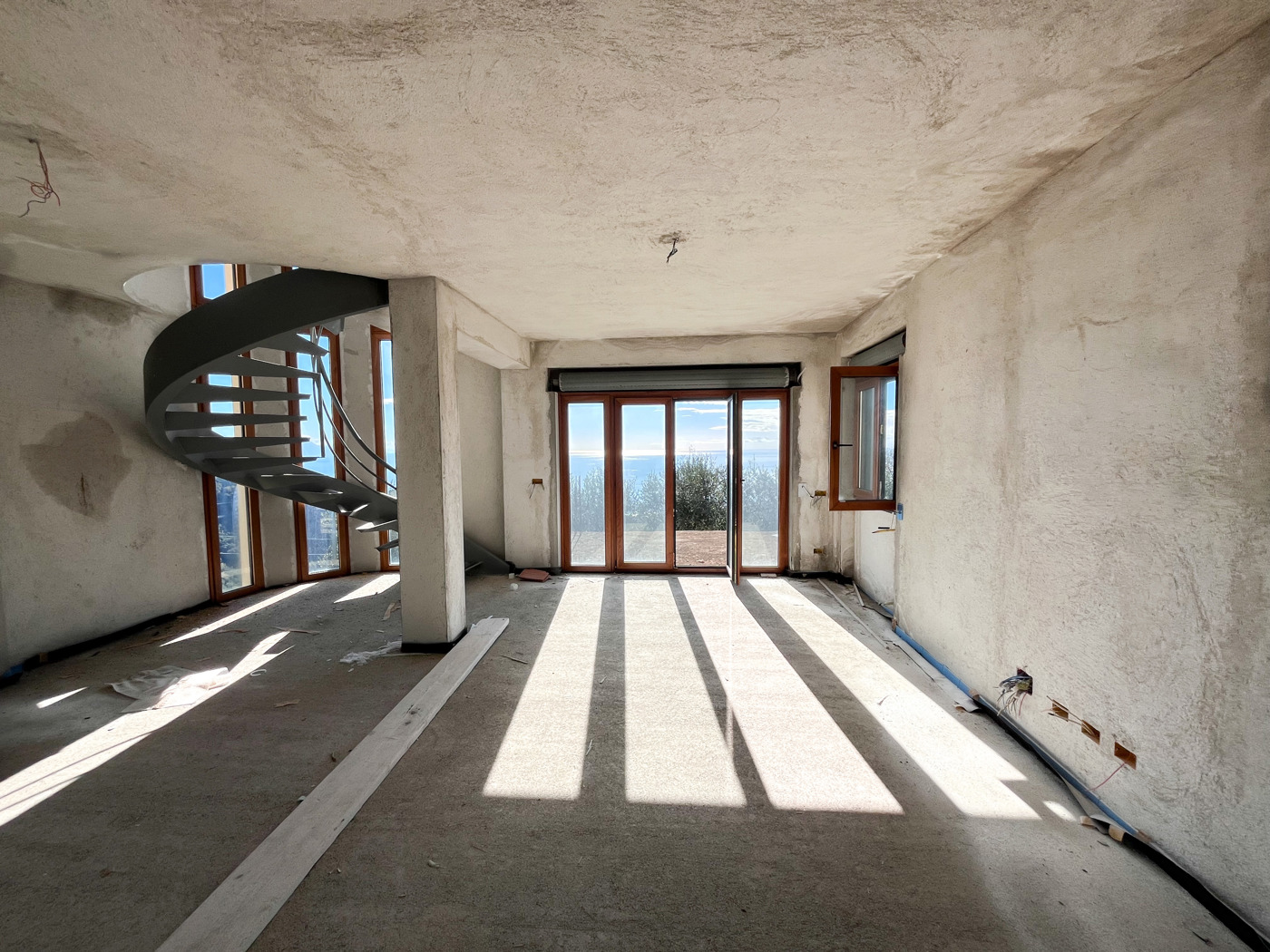 Attualmente si sviluppa su tre livelli e si compone al piano seminterrato da locali deposito con antistante portico, una particolare scala esterna conduce al piano rialzato dove troviamo un salone con vetrate che affaccia su di un terrazzo da cui si pu ammirare una splendida vista mare, cucina abitabile, 3 camere da letto e 2 bagni, infine, una scala elicoidale conduce al piano mansarda dove presente un unico ambiente con terrazzo con vista mare mozzafiato.