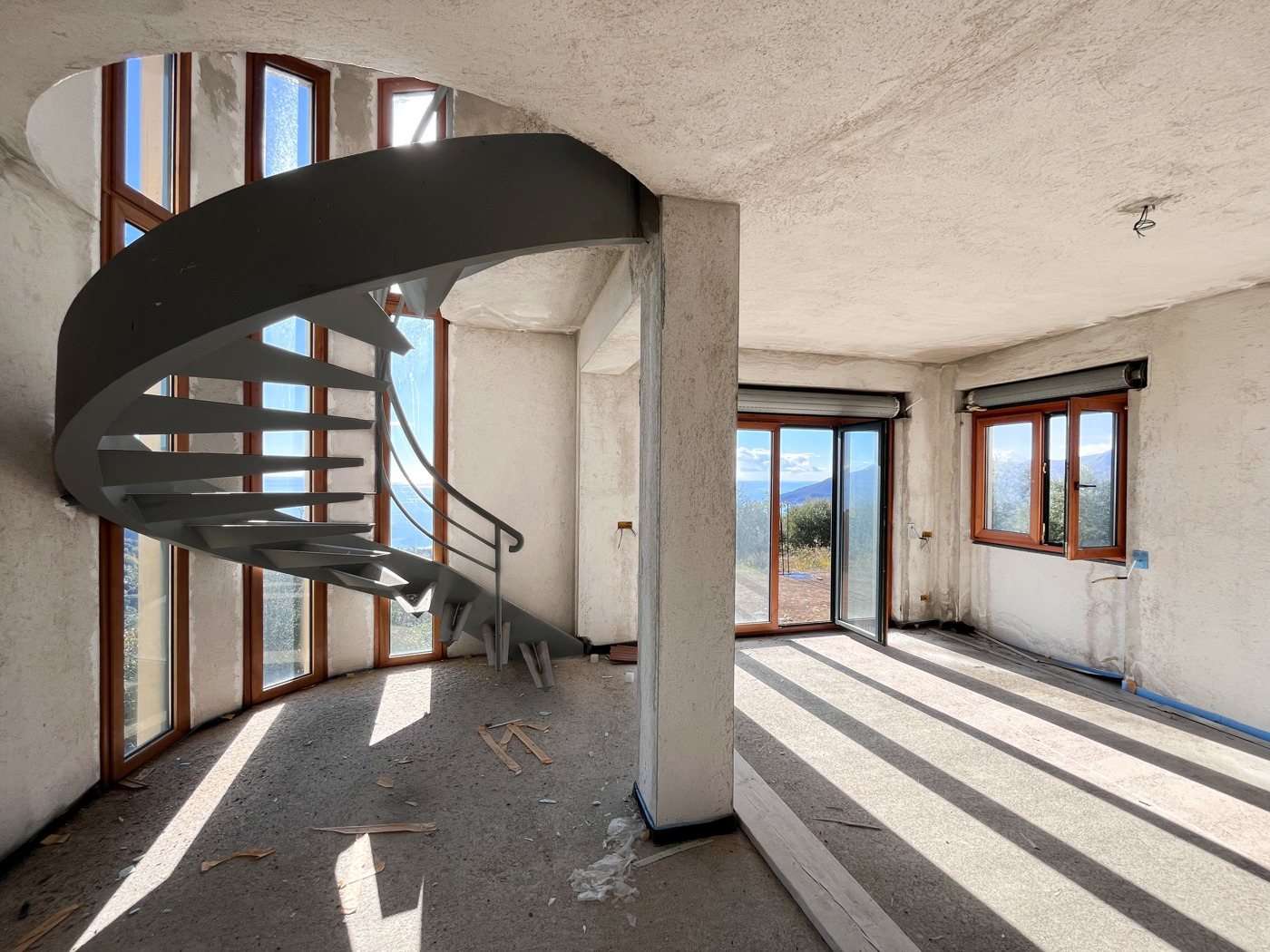 Attualmente si sviluppa su tre livelli e si compone al piano seminterrato da locali deposito con antistante portico, una particolare scala esterna conduce al piano rialzato dove troviamo un salone con vetrate che affaccia su di un terrazzo da cui si pu ammirare una splendida vista mare, cucina abitabile, 3 camere da letto e 2 bagni, infine, una scala elicoidale conduce al piano mansarda dove presente un unico ambiente con terrazzo con vista mare mozzafiato.