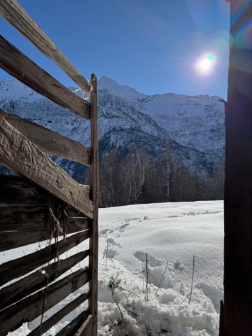 E' circondato su ogni lato dall'ampio terreno di propriet di mq. 2500 ed ha annesso una sottostante zona di bosco scoscesa di altri 2800 mq.. Il luogo altamente panoramico, proprio all'ingresso della localit, con esposizione al sud: l'ampia visuale spazia dai 4000 delle Alpi svizzere ad ovest alle montagne poste di fronte a Varzo sul fronte a sud ed all'abitato di Trasquera verso il fondovalle sul fianco est. Il fabbricato fruisce di proprio accesso veicolare anche nell'inverno (con circa 60 metri di sterrato) e di ampia zona di parcheggio.