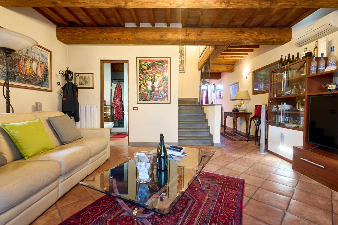 La splendida scala in pietra serena conduce al piano superiore, dove si apre la zona notte: una camera padronale con bagno en suite, finestrato e con doccia; una seconda camera matrimoniale; una terza stanza versatile, ideale come studio privato o guardaroba; un ulteriore bagno finestrato con doccia, raffinato e funzionale.