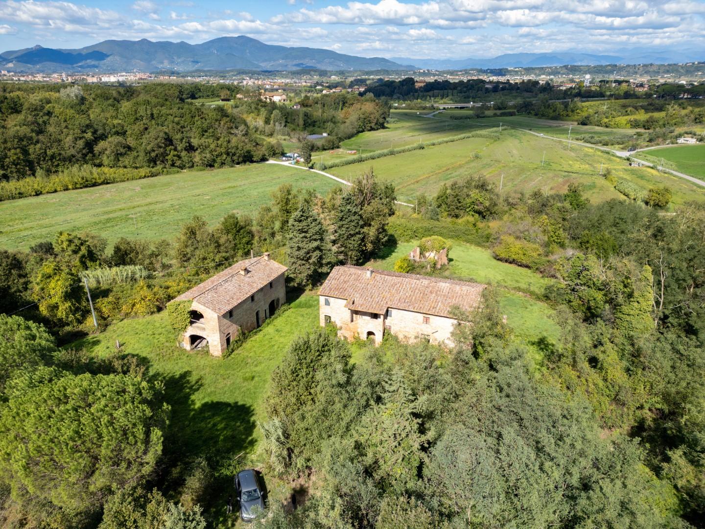 La casa colonica principale (circa 448 mq), con tipica scala esterna, si sviluppa su due livelli ed è arricchita da una suggestiva tettoia da ripristinare, con la possibilità di realizzare una terrazza panoramica sovrastante.