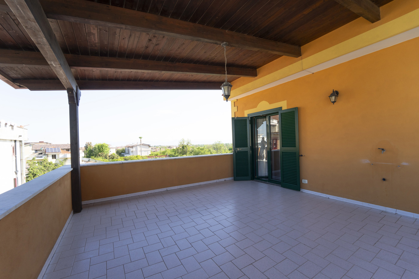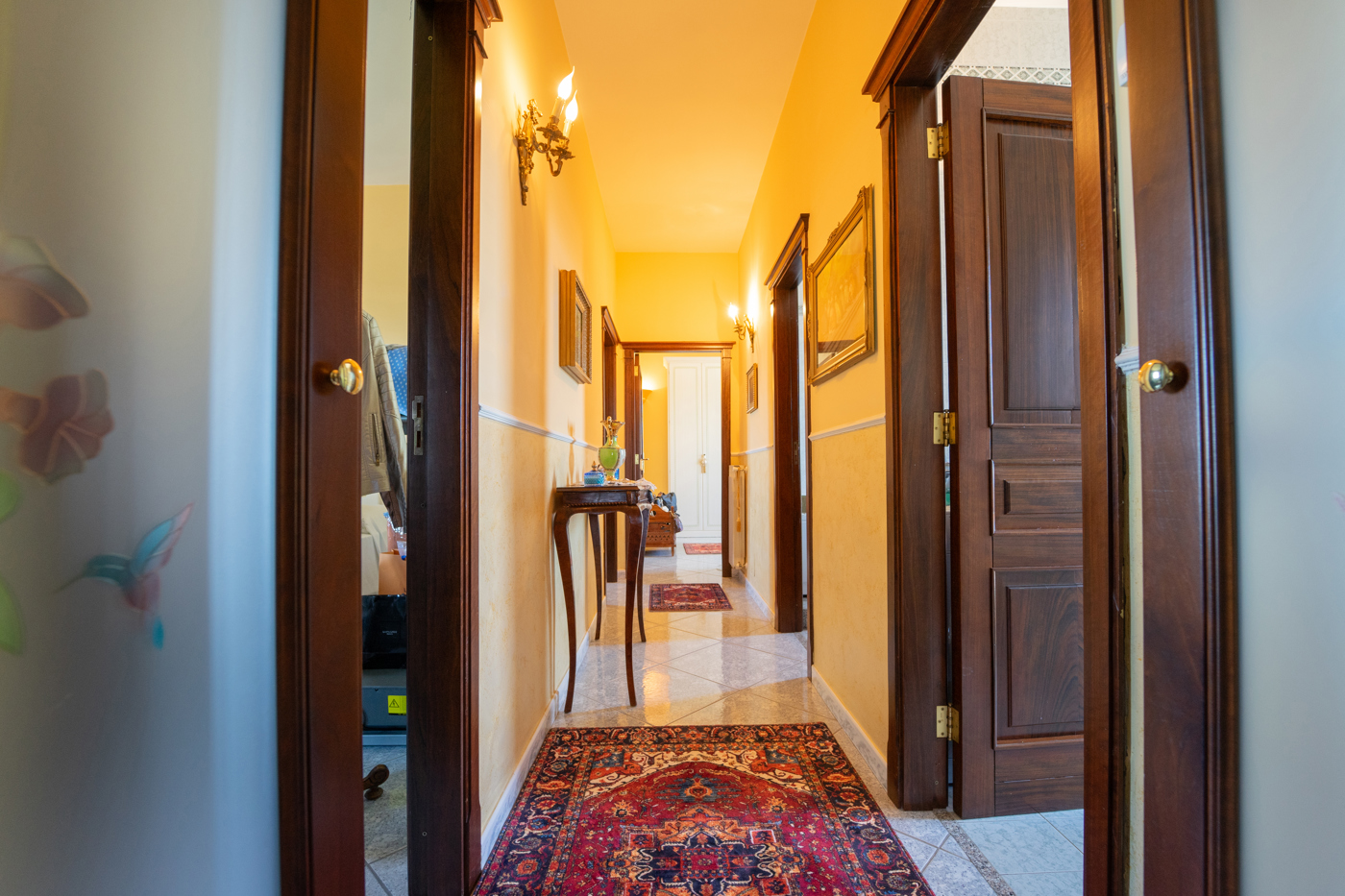 L'ingresso si apre su un accogliente disimpegno che conduce alla zona giorno: una cucina abitabile e un salone ampio e luminoso, entrambi con accesso al grande terrazzo a livello.