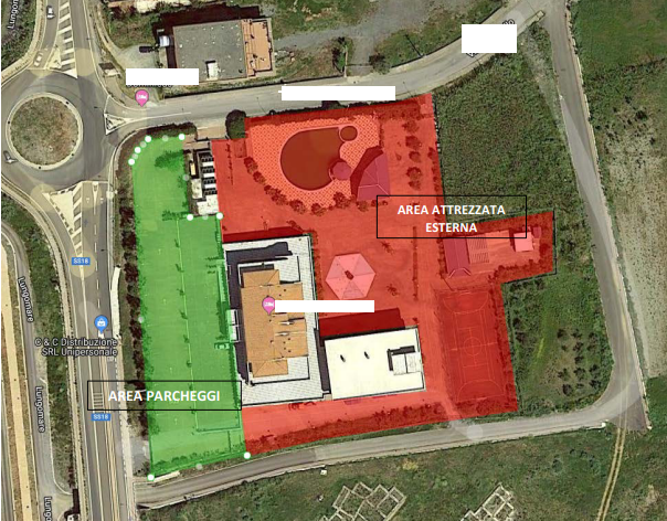 La proprietà include inoltre campo sportivo polivalente, anfiteatro, locali tecnici e area parcheggio di circa mq 3.000 idonea anche per posteggio autobus.