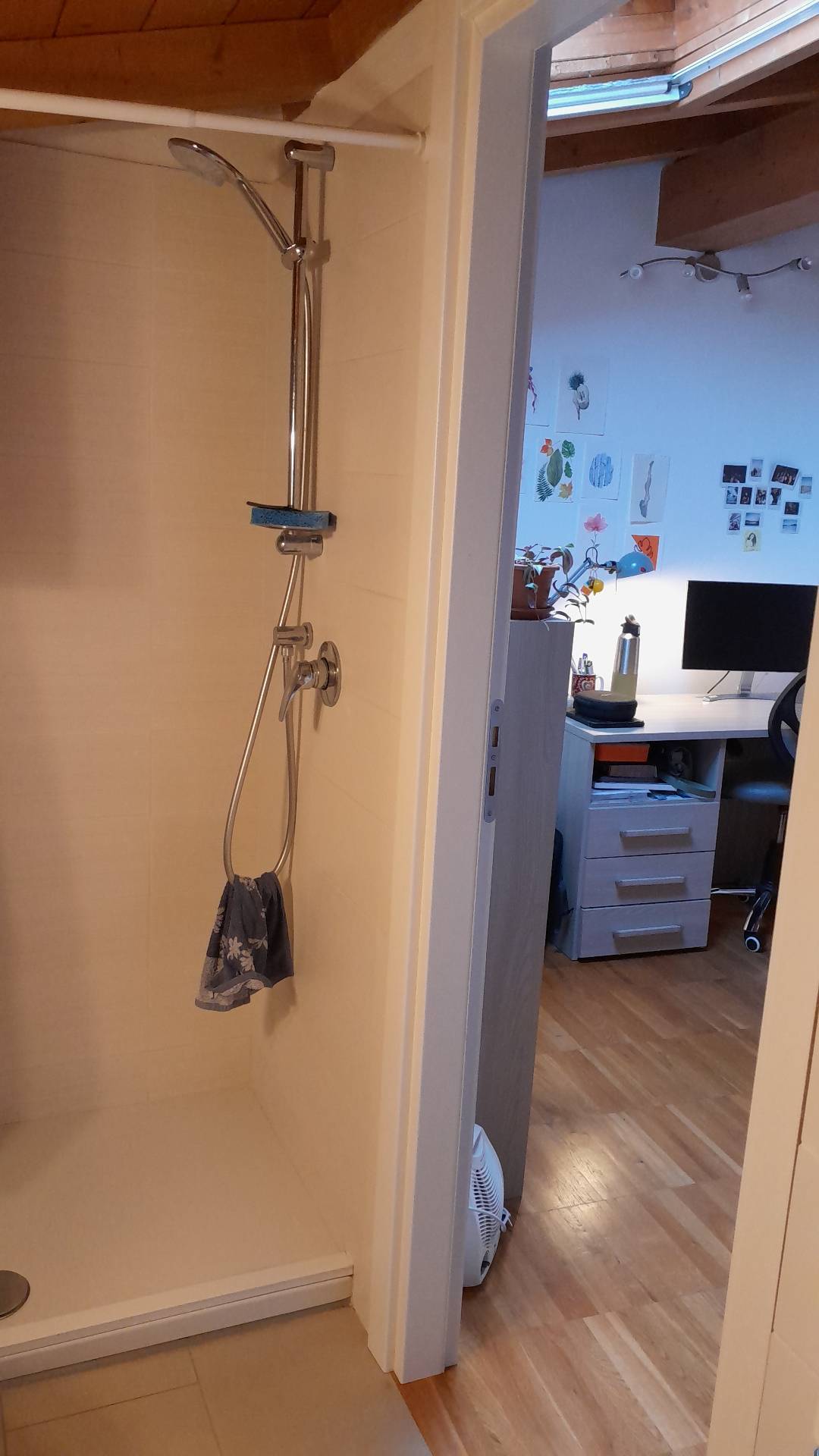 In a small condominium and apartment with four bedrooms, a kitchen, and three bathrooms, this spacious attic room is available for rent. It features a private bathroom, walk-in closet, parquet floors, air conditioning, a king-sized bed, and use of the kitchen with a balcony.
