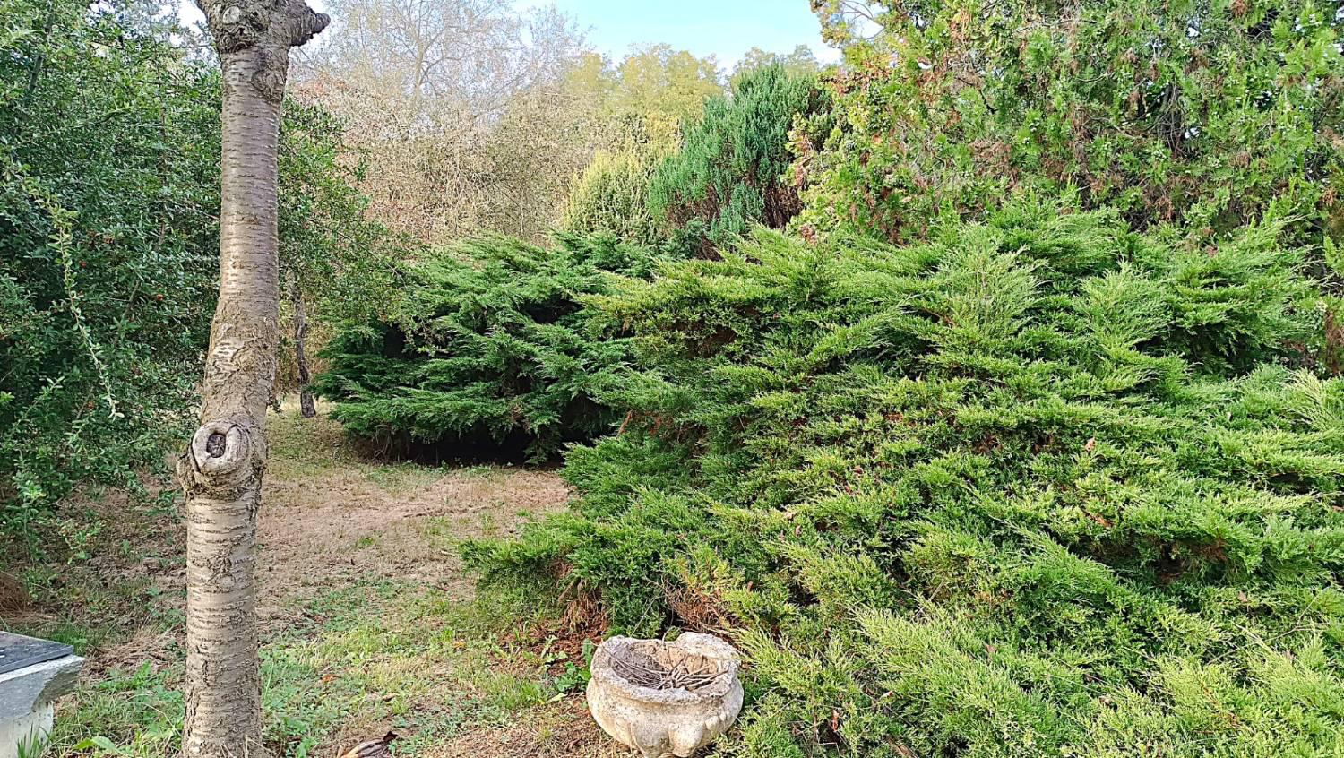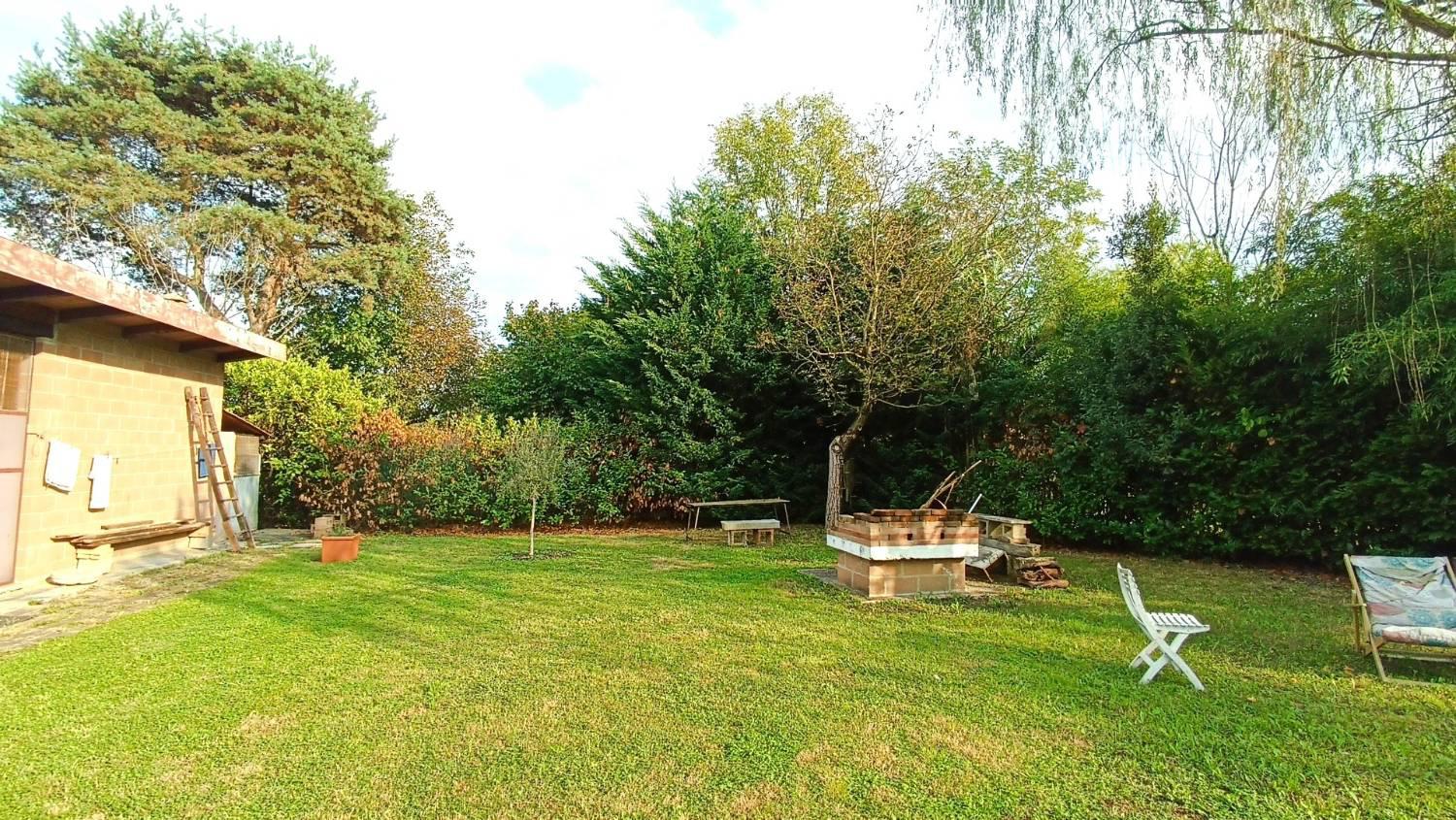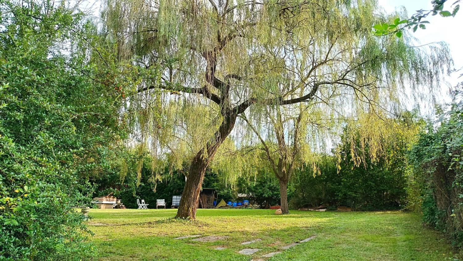 Il terreno, completamente recintato e molto curato, ospita numerose piante ornamentali e da frutto, una grande zona relax con area barbecue, e due maestosi salici piangenti che regalano ombra e atmosfera unica nelle giornate estive.