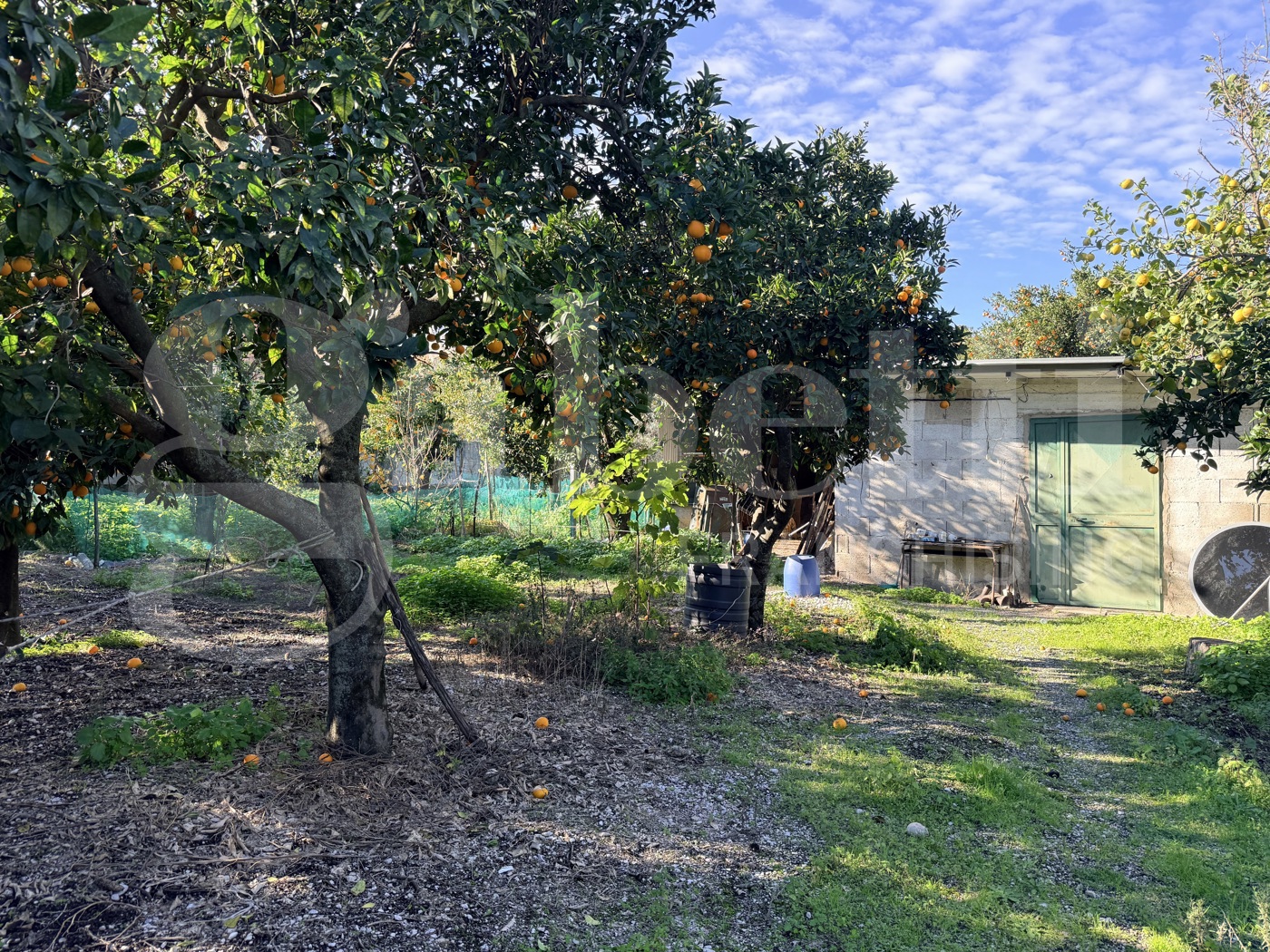 Agrumeto maturo e produttivo, con arance, limoni e altri alberi da frutto.