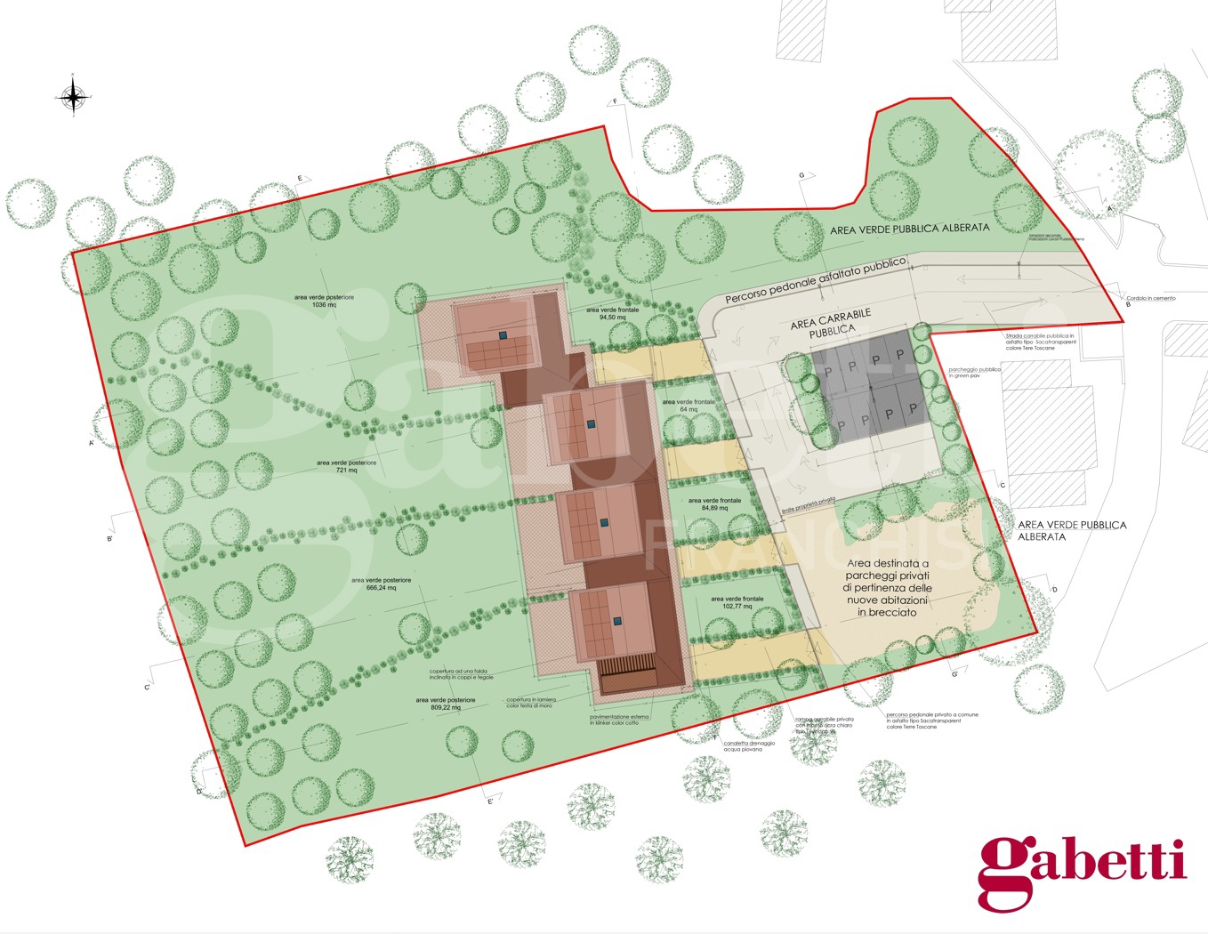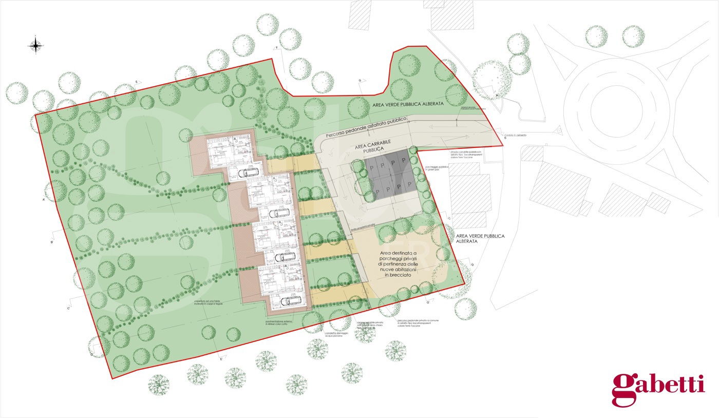 Inoltre sono previste aree a giardino privato, zone carrabili per l'accesso ai box e camminamenti pedonali.
