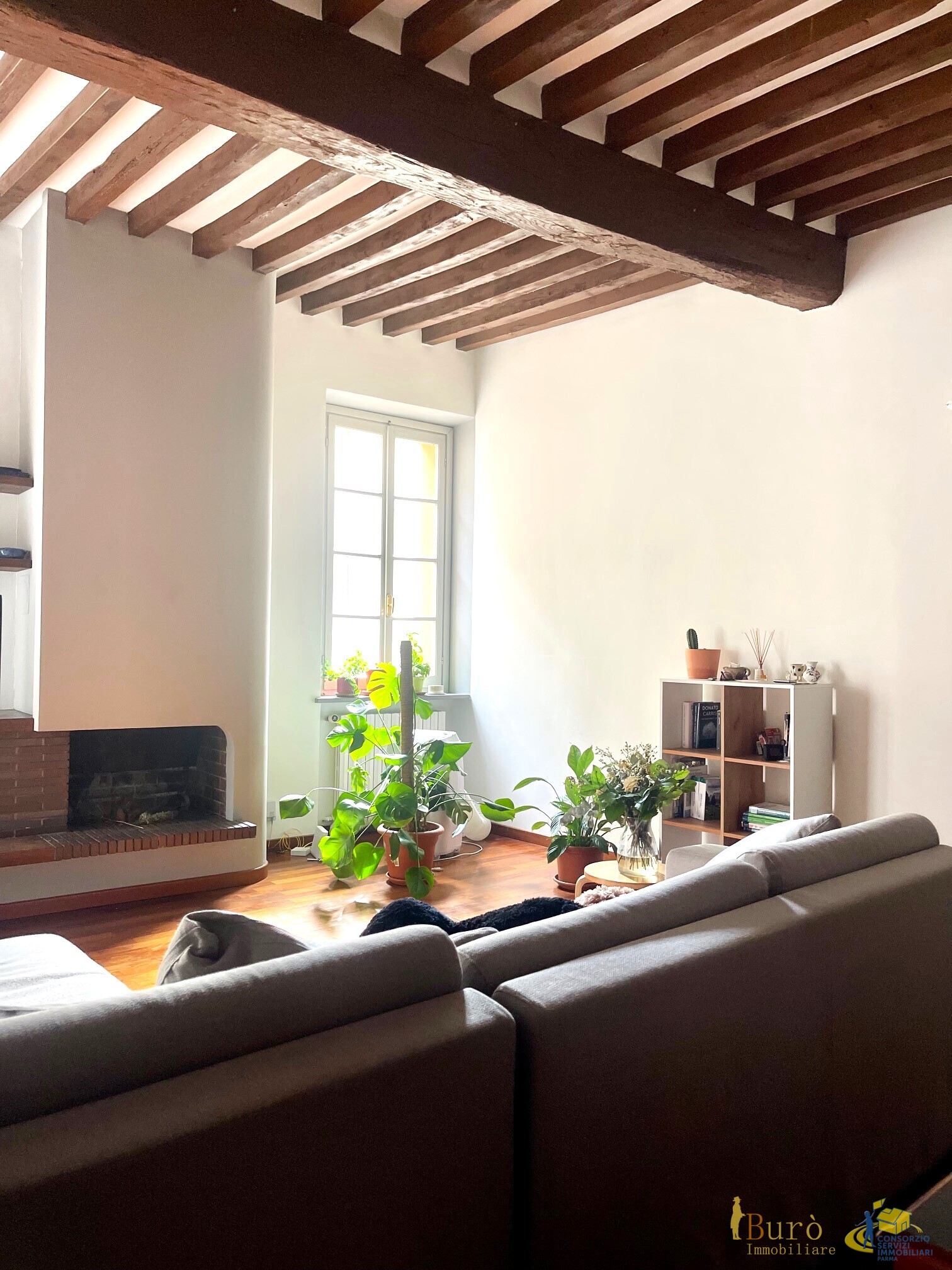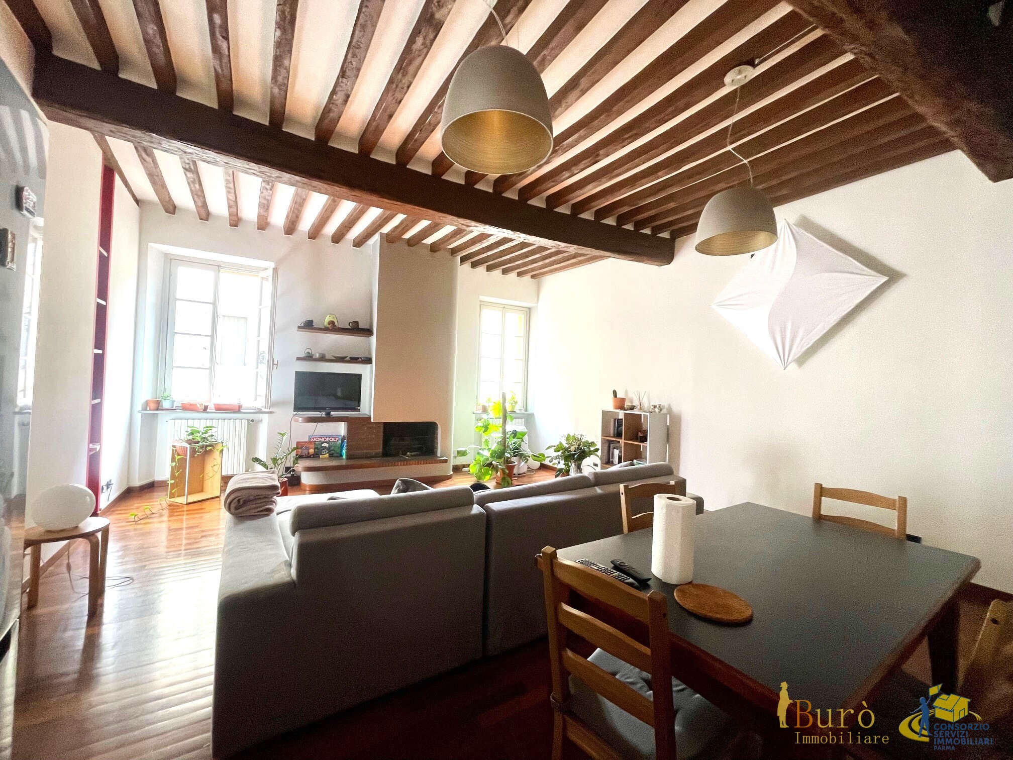 All'interno di casa tri-familiare: appartamento di 86 mq composto da bellissima zona giorno open space con doppia finestra esposta a sud, e angolo cottura separato; disimpegno con ripostiglio; camera matrimoniale con suggestiva vista sui giardini del parco ducale, studio (piccola camera singola) e bagno; completa l'immobile una comoda cantina/lavanderia al piano terra.