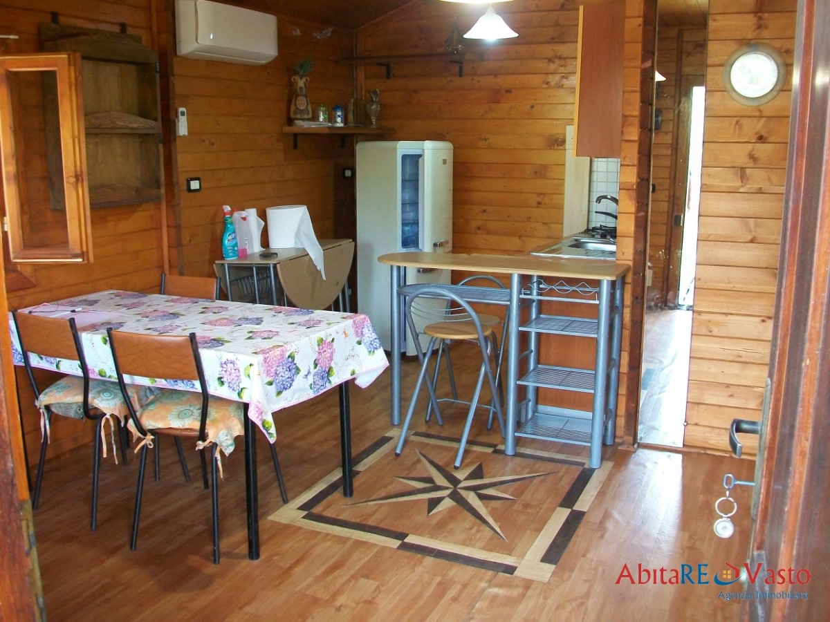 Pollutri (CH). In un piccolo centro poco distante da Vasto, in posizione collinare, a circa 9 km dal mare, lontano dal traffico cittadino e dai rumori del centro abitato, proponiamo in locazione solo per la stagione estiva, un piccolo chalet in legno, ben arredato, indipendente e circondato da un ampio spazio esterno, così composto: zona living con angolo cucina, 2 camere da letto, piccolo bagno con doccia e comoda veranda esterna attrezzata.