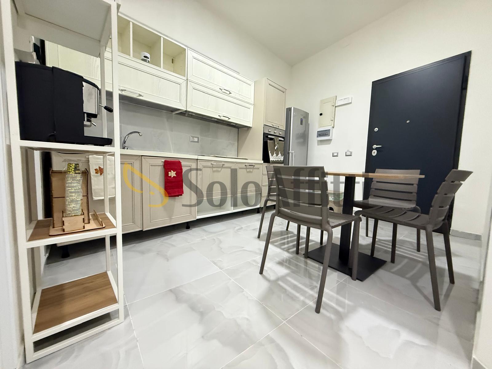 Lingresso si apre direttamente su una cucina abitabile, moderna e completamente attrezzata.