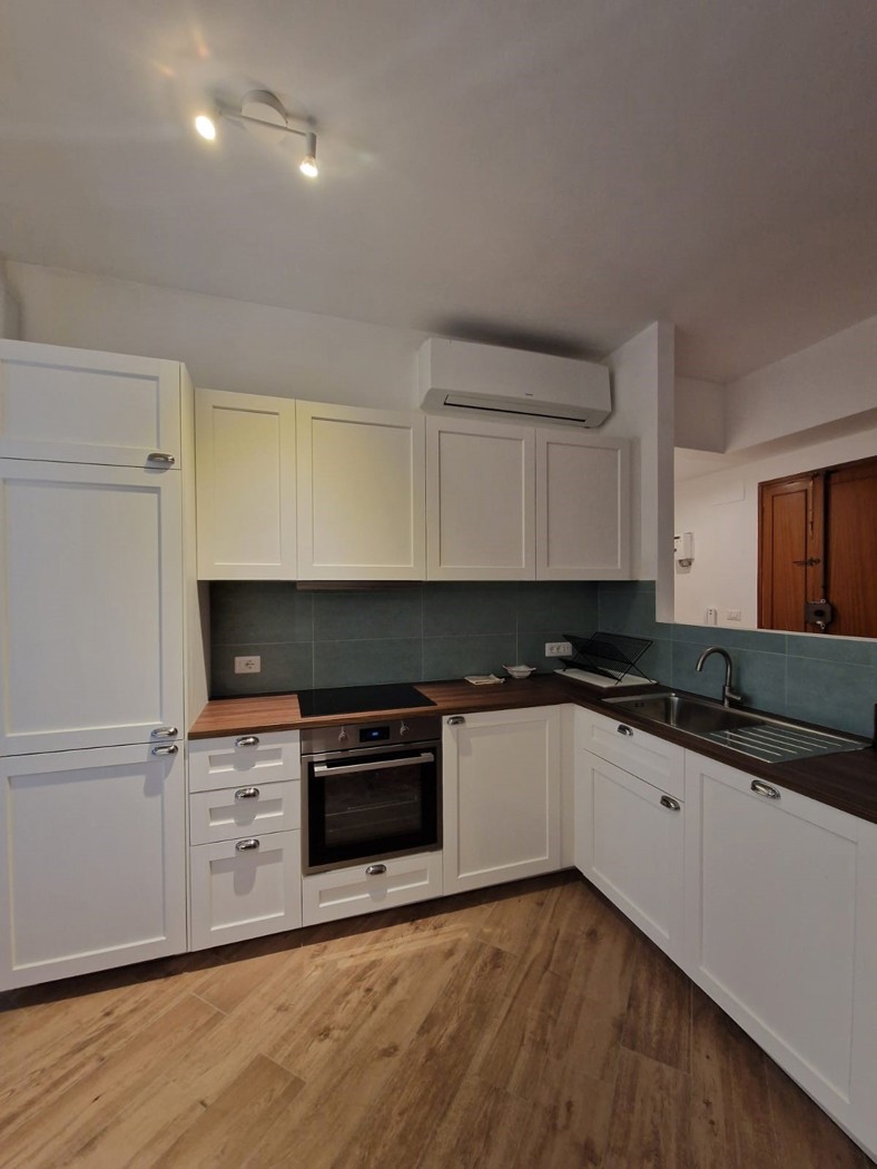 Lappartamento si apre su un ampio salone con cucina a vista, moderna e completamente attrezzata con piano a induzione e lavastoviglie.