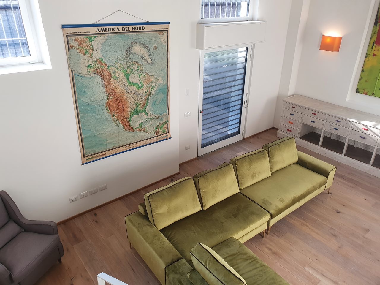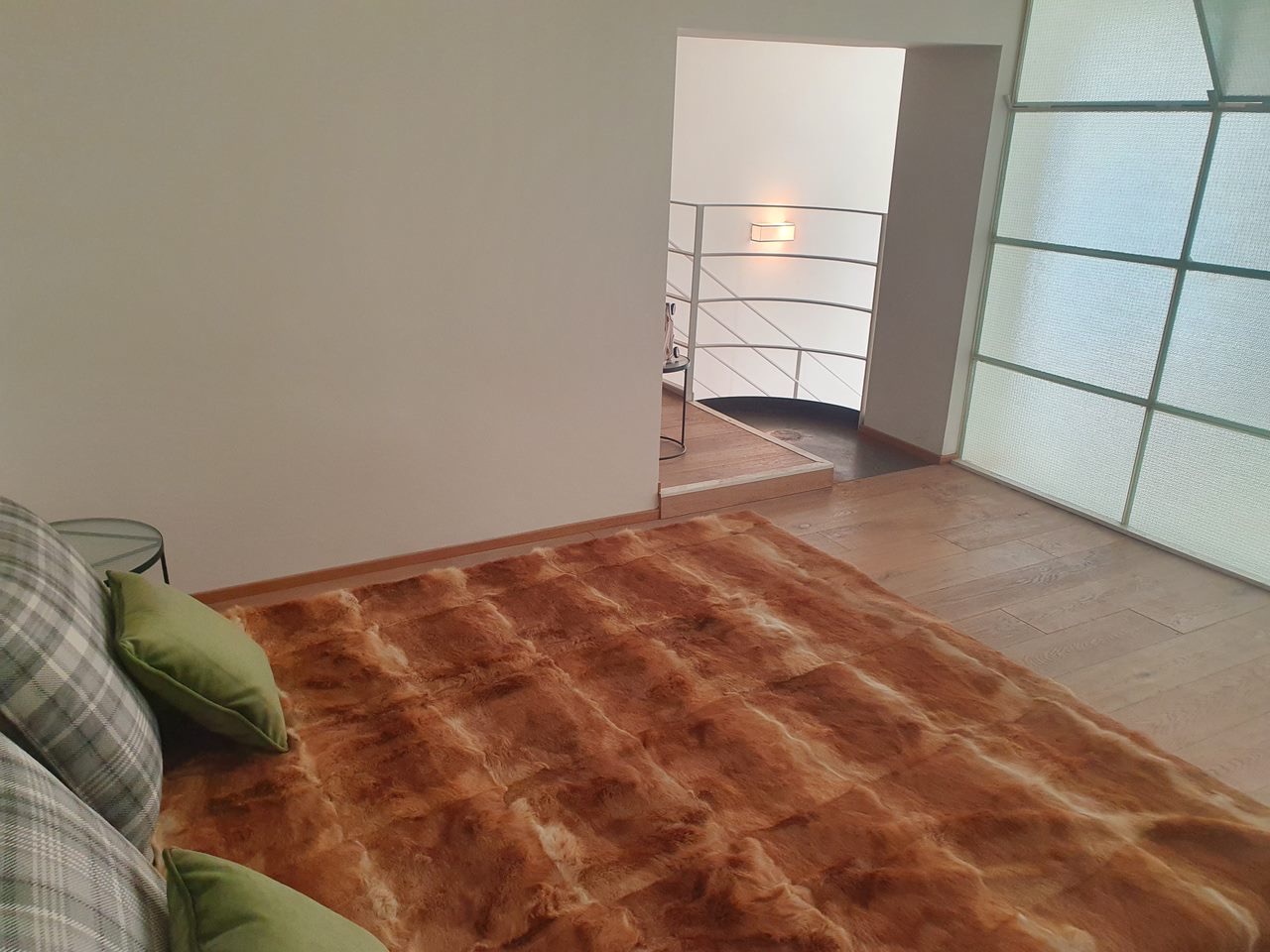 Una scala elegante porta alla zona notte, che include una camera matrimoniale e una seconda camera con divano letto, perfetta per ospiti.
