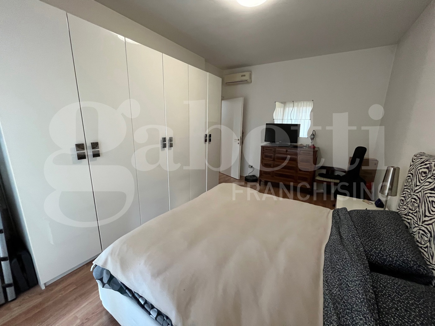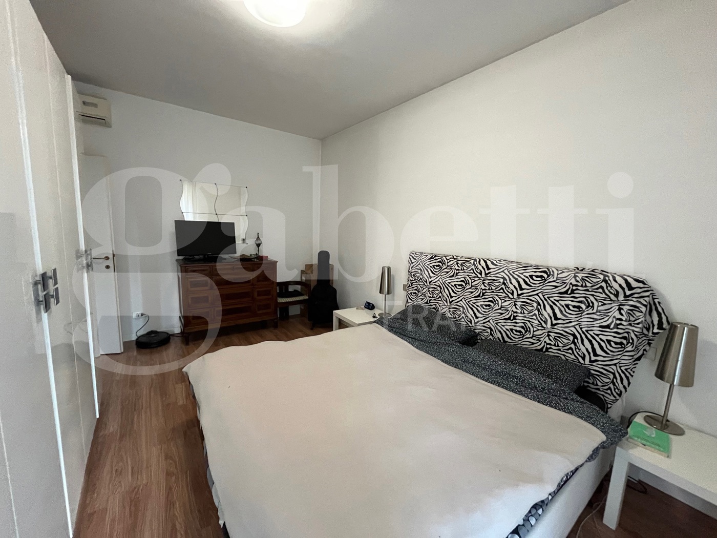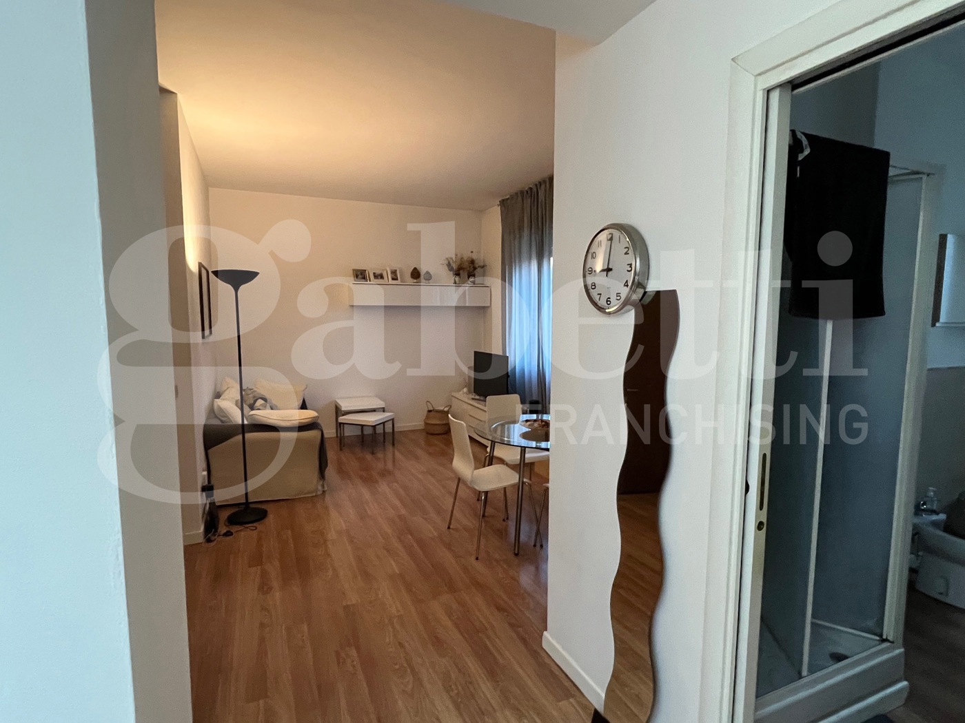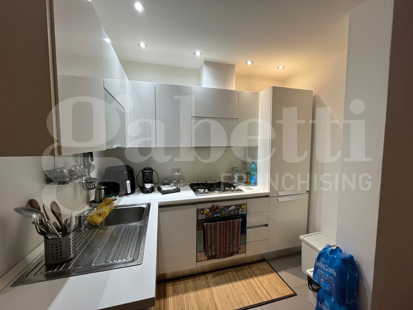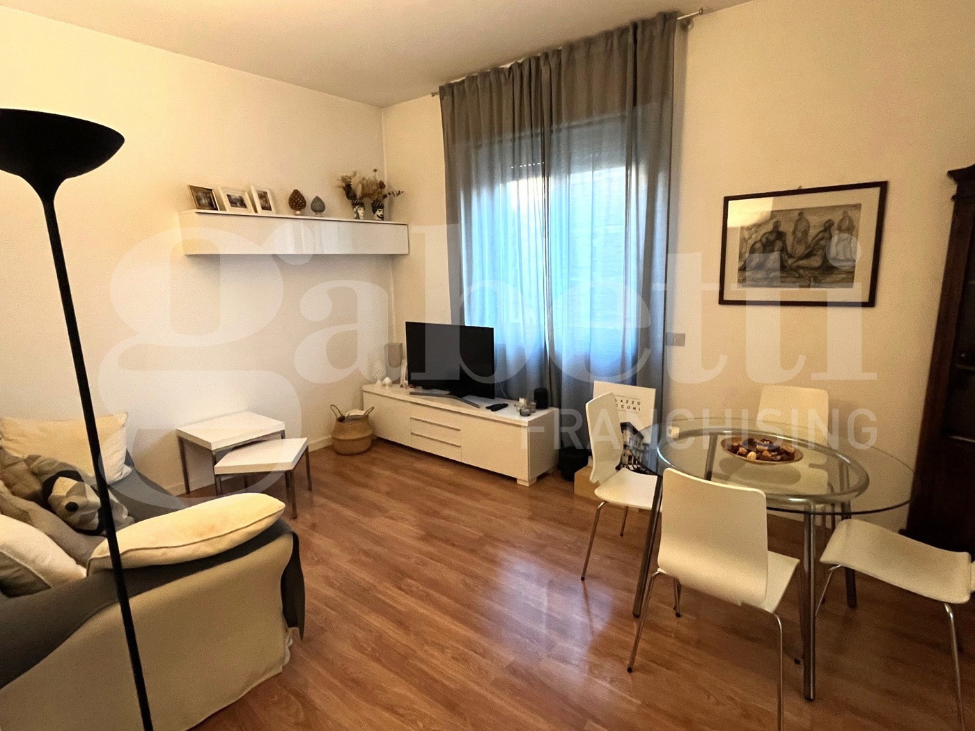 L'appartamento, situato al piano intermedio, arredato con gusto e offre un ingresso accogliente, un soggiorno con cucina a vista, due camere da letto, un bagno e un balcone.