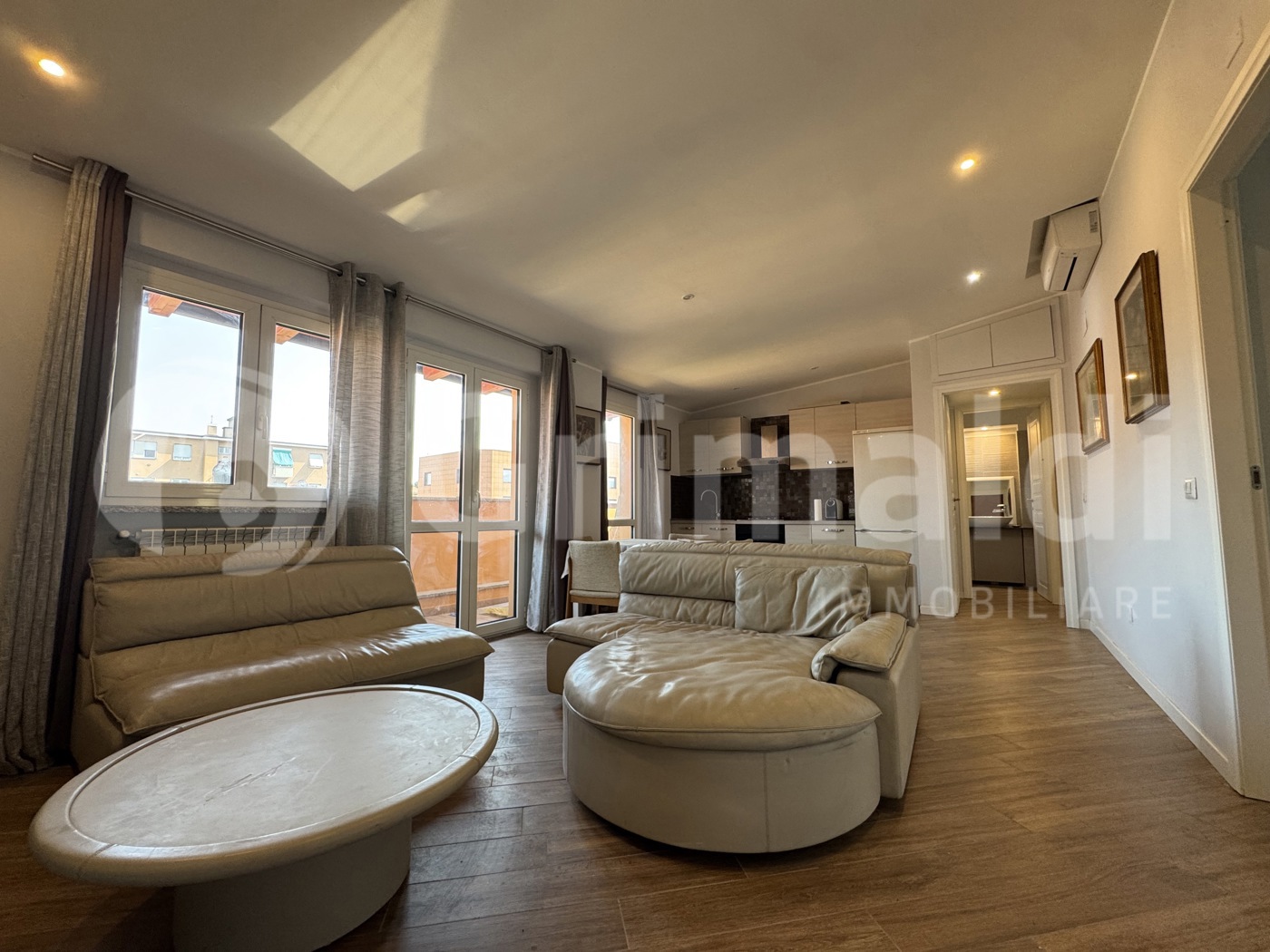Lingresso si apre su unaccogliente zona giorno con soggiorno e cucina a vista, con accesso diretto al balcone di 7,50 mq, ideale per momenti di relax allaperto.