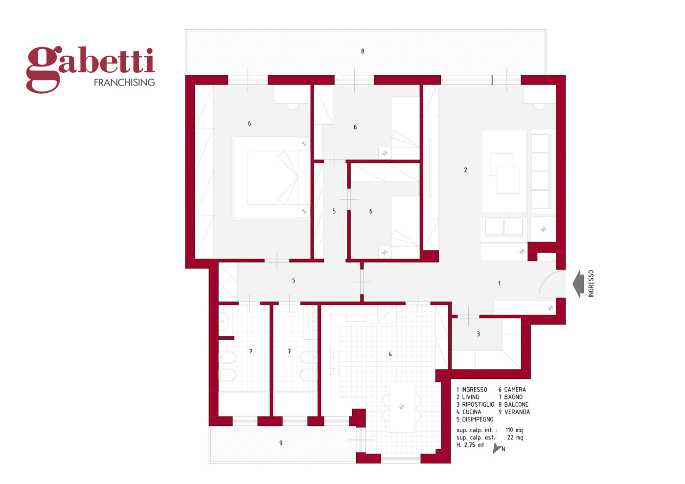 Lappartamento, posto al piano rialzato di un edificio in cemento armato, si sviluppa su circa 110 mq interni oltre 20 mq di spazi esterni distribuiti tra balcone e balcone verandato.