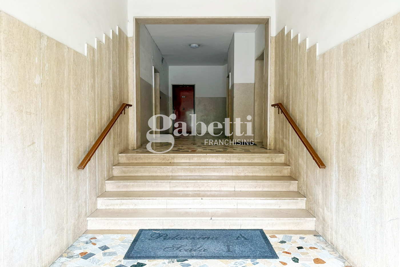 Lingresso ampio conduce a una zona living spaziosa e luminosa, con accesso diretto al balcone con affaccio in parco.