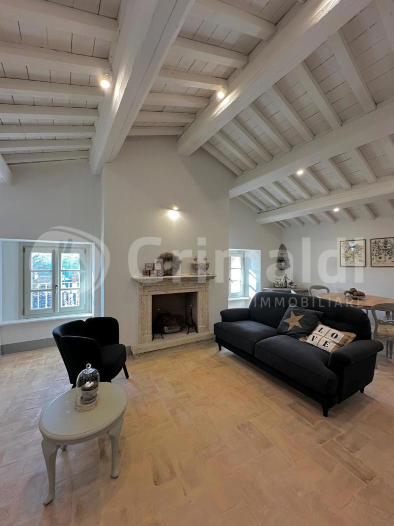 Lingresso si apre su un ampio soggiorno impreziosito da un elegante camino e da un angolo cottura a induzione integrato, creando uno spazio accogliente e sofisticato per la zona giorno.