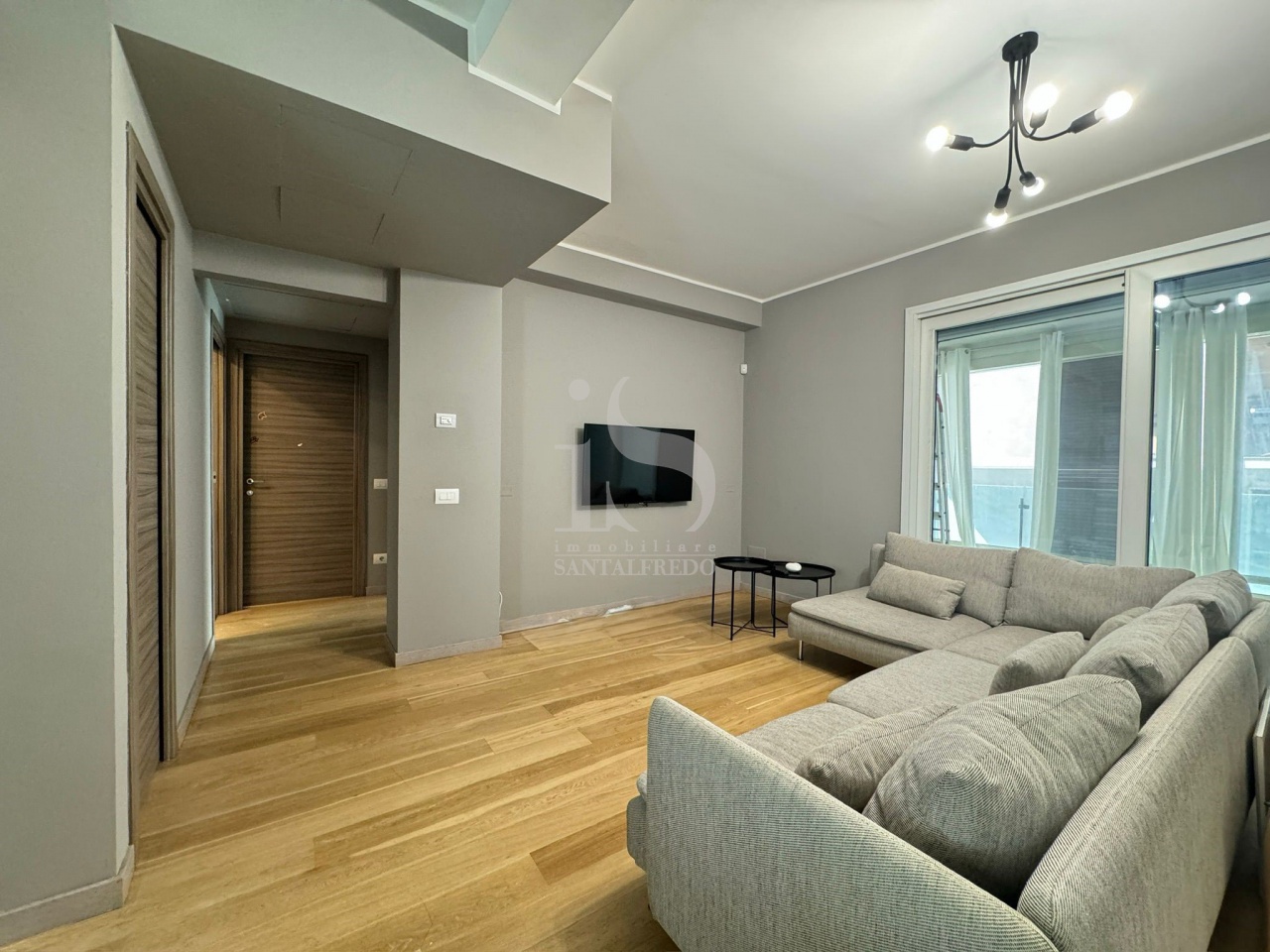 Entrando, accoglie una zona giorno spaziosa con cucina a vista sulla sinistra e un ampio soggiorno a destra, da cui si accede a un meraviglioso terrazzo coperto di 45 mq, arricchito da tende, perfetto per momenti di relax o convivialità. Il parquet corre lungo tutta la casa, mentre i serramenti con triplo vetro e tapparelle automatizzate garantiscono comfort e isolamento acustico.