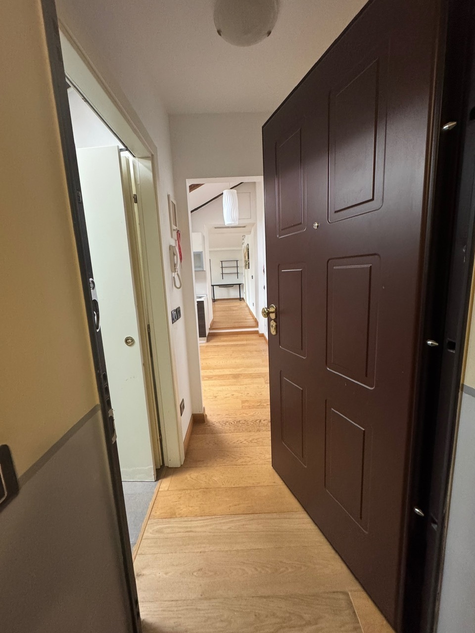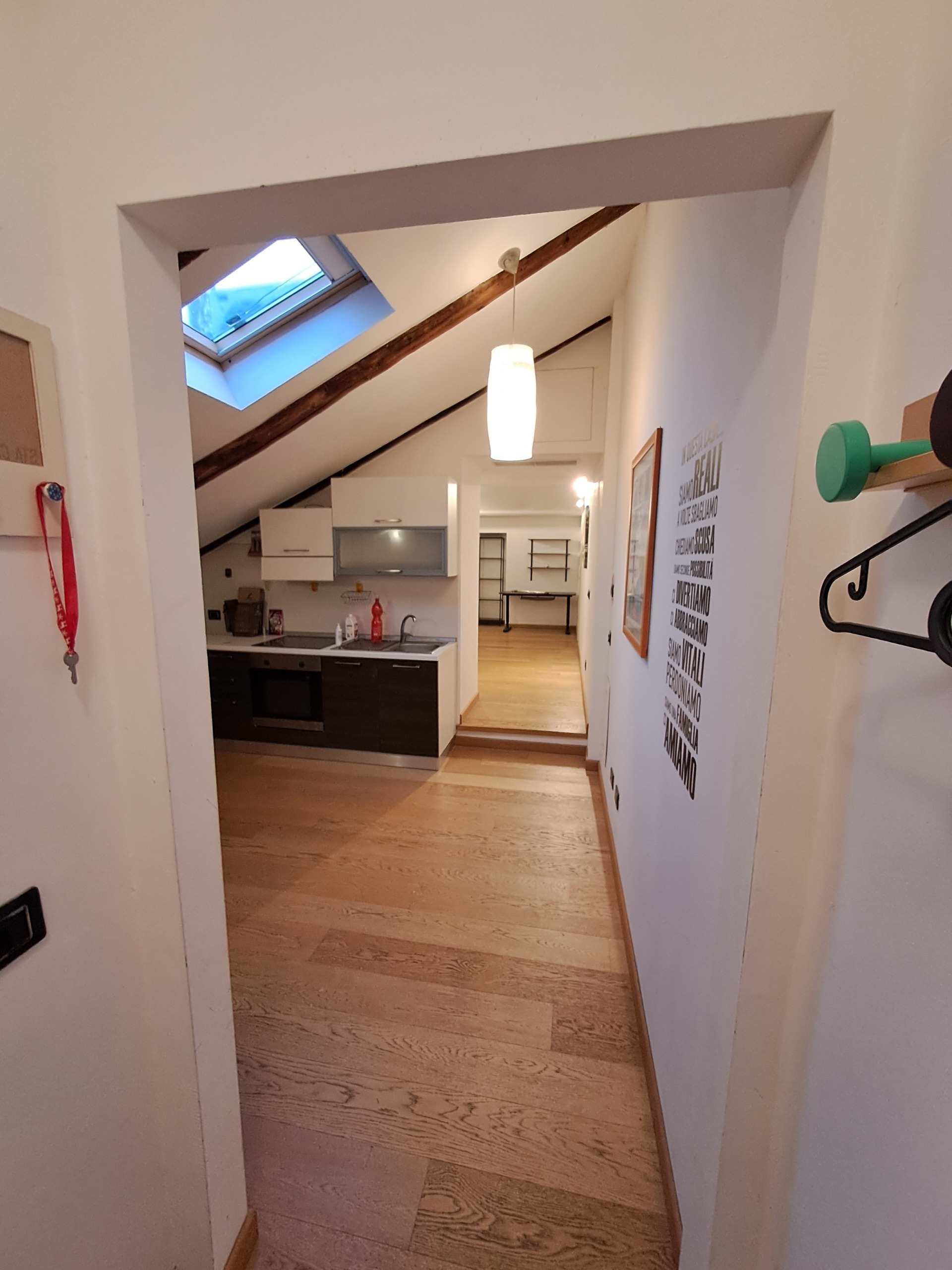 L'appartamento di circa 86 mq., con splendida vista sulla piazza, è così composto: ingresso, zona giorno con cucina attrezzata a vista, luminoso ampio soggiorno con 3 finestre e particolari davanzali in pietra, camera da letto matrimoniale, servizio completo di sanitari e presenza di doccia e cantina Lappartamento, caratterizzato da travi a vista, è dotato di uno splendido pavimento in legno di rovere che valorizza maggiormente lunità immobiliare.