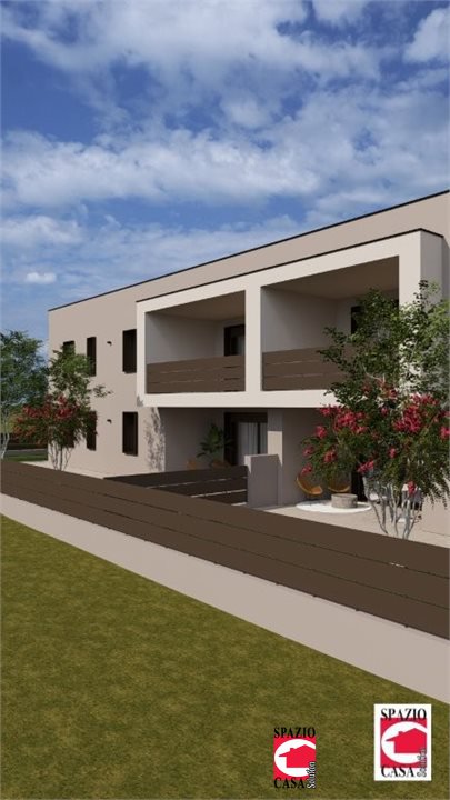 TRILOCALE POSTA AL PIANO TERRA IN COSTRUENDA PALAZZINA.\nClassica disposizione con soggiorno con zona cottura/pranzo e zona salotto, con prospiciente portico vivibile, due camere da letto (matrimoniale e doppia) oltre a bagno con comodo antibagno/lavanderia.\nPiccolo giardino di proprietà e box doppio al piano interrato.