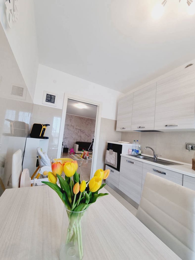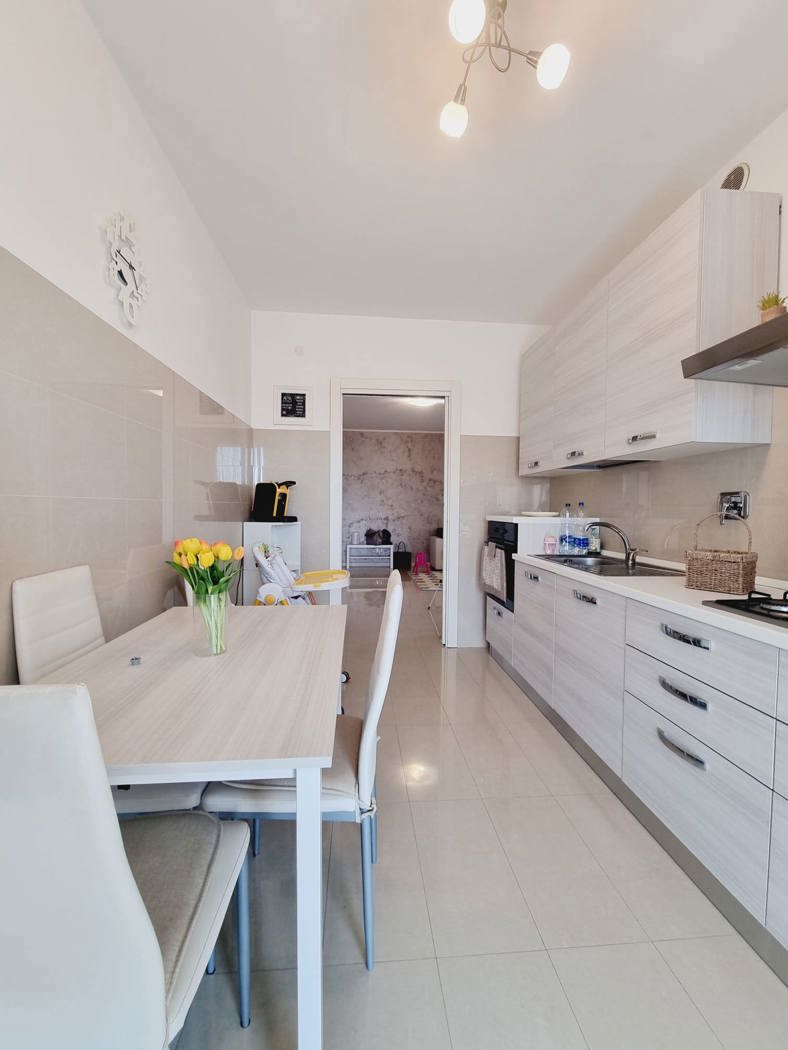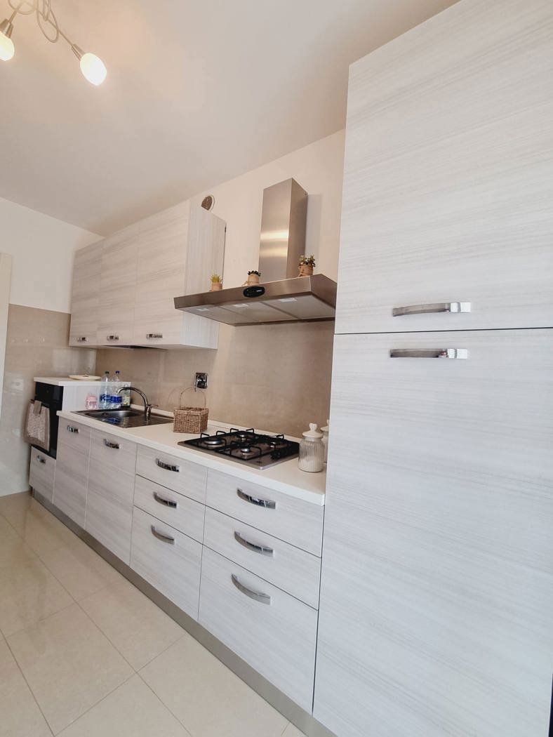 Composizione interna: ingresso su ampio salone a vista, luminoso e accogliente, con accesso diretto a un terrazzo vivibile, cucina abitabile, separata e funzionale, con accesso a un balcone comunicante con il terrazzo.